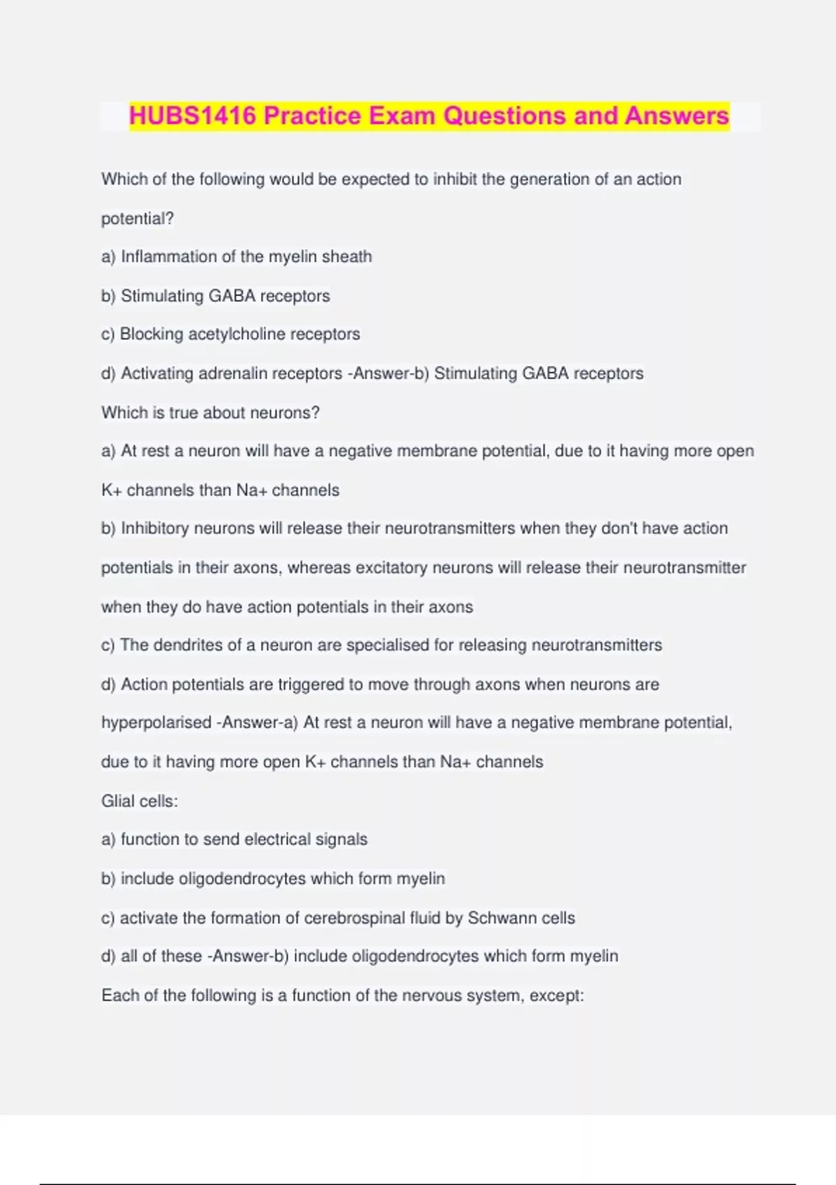 HUBS1416 Practice Exam Questions and Answers Which of the following would be expected to inhibit the generation of an action potential? a) Inflammation of the myelin sheath b) Stimulating GABA receptors c) Blocking acetylcholine receptors d) Activating adrenalin receptors -Answer-b) Stimulating GABA receptors Which is true about neurons? a) At rest a neuron will have a negative membrane potential, due to it having more open K+ channels than Na+ channels b) Inhibitory neurons will release their neurotransmitters when they don't have action potentials in their axons, whereas excitatory neurons will release their neurotransmitter when they do have action potentials in their axons c) The dendrites of a neuron are specialised for releasing neurotransmitters d) Action potentials are triggered to move through axons when neurons are hyperpolarised -Answer-a) At rest a neuron will have a negative membrane potential, due to it having more open K+ channels than Na+ channels Glial cells: a) function to send electrical signals b) include oligodendrocytes which form myelin c) activate the formation of cerebrospinal fluid by Schwann cells d) all of these -Answer-b) include oligodendrocytes which form myelin Each of the following is a function of the nervous system, except: a) providing sensation of the internal and external environments. b) integrating sensory information. c) directing activities that continue for extended periods, such as growth and pregnancy. d) coordinating voluntary and involuntary activities. e) regulating or controlling peripheral structures and systems. -Answer-c) directing activities that continue for extended periods, such as growth and pregnancy. Sensory neurons travelling in a cranial nerve would be part of the __________ division of the __________. a) efferent, PNS b) efferent, CNS c) afferent, CNS d) afferent, PNS -Answer-d) afferent, PNS Opening of sodium channels in the membrane of a neuron results in: a) depolarisation. b) increased negative charge inside the membrane. c) reestablishing the resting potential. d) repolarisation. -Answer-a) depolarisation. Which of the following is true regarding the Babinski reflex? a) A negative Babinski sign in an adult indicates damage to descending motor tracts or higher centres that normally provide inhibition to spinal reflexes b) A positive Babinski sign in an adult indicates damage to descending motor tracts or higher centres that normally provide inhibition to spinal reflexes. c) Plantar flexion is a positive Babinski sign and is normal in adults and infants d) Plantar flexion is a negative Babinski sign and is pathological in adults and infants - Answer-b) A positive Babinski sign in an adult indicates damage to descending motor tracts or higher centres that normally provide inhibition to spinal reflexes. Proprioceptors: a) monitor the positions of joints and muscles. b) monitor the external environment. c) monitor the senses of taste and smell. d) monitor the digestive tract. -Answer-a) monitor the positions of joints and muscles. Which cranial nerve is important for some eye movements, pupillary constriction and eyelid raising? a) Facial (VII) b) Oculoptic (III) c) Oculomotor (III) d) Abducens (VI) -Answer-c) Oculomotor (III) Which is true regarding the function of the ear? a) The semi-circular canals are filled with a fluid to allow sound waves to displace the hair cells b) Activation of the tympanic membrane will result in movement of the ossicles which will be interpreted in the brain as a change in balance c) Movement of hair cells in the cochlea will result in signalling through the vesitbulocochlear nerve to the cerebellum d) None of these are correct -Answer-d) None of these are correct A 30 year-old man sought medical help because his hearing seemed to be deteriorating and he was having a problem with tinnitus. The doctor found significant hearing loss in his right ear. Further investigations showed a tumour growing on a nerve. Which nerve would the tumour have to be on to produce the effects described? a) Cranial nerve III b) Vagus nerve (CN X) c) Cranial nerve VIII d) Cranial nerve V -Answer-c) Cranial nerve VIII Jason is experiencing spastic paralysis in his left arm. This could be explained by: a) a lesion in the upper motor neurons on his right side above the medulla b) All of these options are possible c) a lesion in the lower motor neurons of his right spinal cord d) a stroke affecting his left motor cortex -Answer-a) a lesion in the upper motor neurons on his right side above the medulla Lucinda has shingles. The painful eruptions are around her body in a band at around the level of her belly button (umbilicus). What is the infectious agent, and what spinal nerve is affected in Lucinda's case?