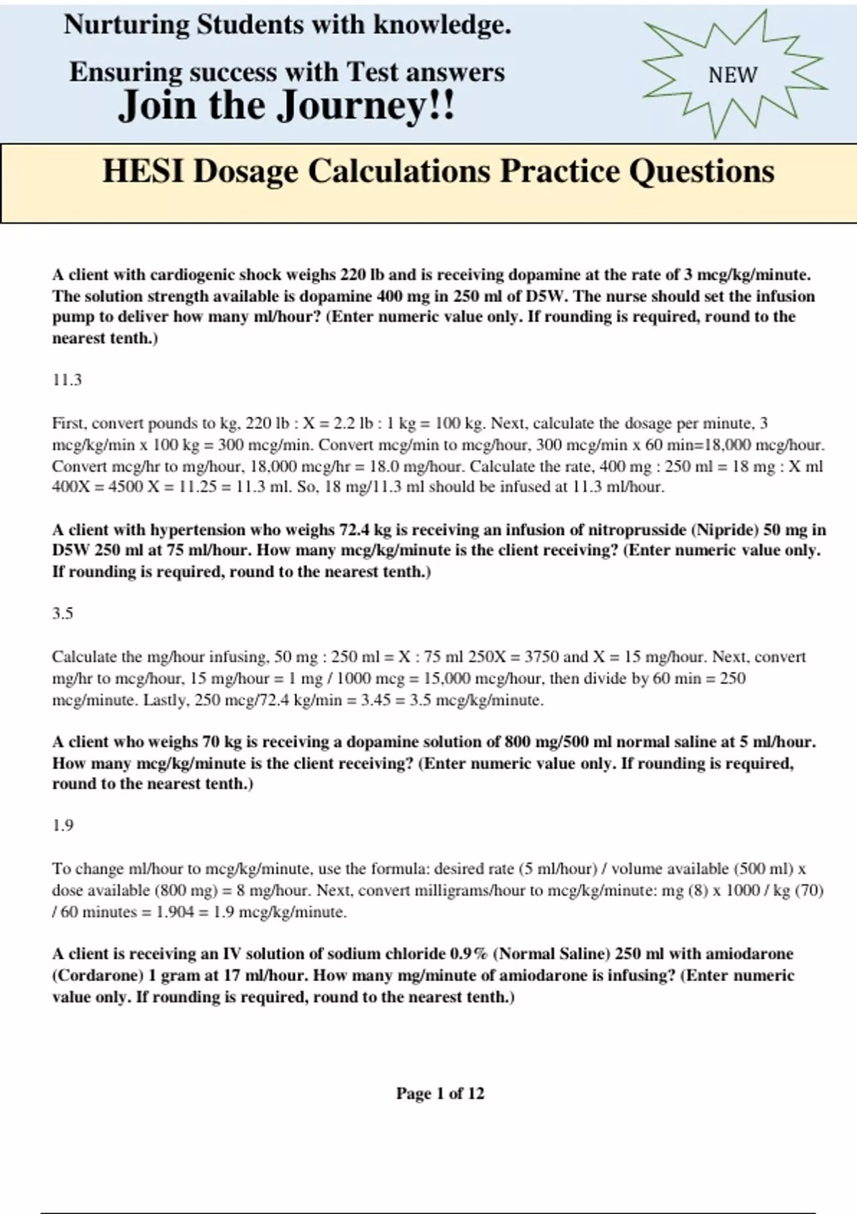 HESI Dosage Calculations Practice Questions. A client with cardiogenic shock weighs 220 lb and is receiving dopamine at the rate of 3 mcg/kg/minute. The solution strength available is dopamine 400 mg in 250 ml of D5W. The nurse should set the infusion pump to deliver how many ml/hour? (Enter numeric value only. If rounding is required, round to the nearest tenth.) 11.3 First, convert pounds to kg, 220 lb : X = 2.2 lb : 1 kg = 100 kg. Next, calculate the dosage per minute, 3 mcg/kg/min x 100 kg = 300 mcg/min. Convert mcg/min to mcg/hour, 300 mcg/min x 60 min=18,000 mcg/hour. Convert mcg/hr to mg/hour, 18,000 mcg/hr = 18.0 mg/hour. Calculate the rate, 400 mg : 250 ml = 18 mg : X ml 400X = 4500 X = 11.25 = 11.3 ml. So, 18 mg/11.3 ml should be infused at 11.3 ml/hour. A client with hypertension who weighs 72.4 kg is receiving an infusion of nitroprusside (Nipride) 50 mg in D5W 250 ml at 75 ml/hour. How many mcg/kg/minute is the client receiving? (Enter numeric value only. If rounding is required, round to the nearest tenth.) 3.5 Calculate the mg/hour infusing, 50 mg : 250 ml = X : 75 ml 250X = 3750 and X = 15 mg/hour. Next, convert mg/hr to mcg/hour, 15 mg/hour = 1 mg / 1000 mcg = 15,000 mcg/hour, then divide by 60 min = 250 mcg/minute. Lastly, 250 mcg/72.4 kg/min = 3.45 = 3.5 mcg/kg/minute. A client who weighs 70 kg is receiving a dopamine solution of 800 mg/500 ml normal saline at 5 ml/hour. How many mcg/kg/minute is the client receiving? (Enter numeric value only. If rounding is required, round to the nearest tenth.) 1.9 To change ml/hour to mcg/kg/minute, use the formula: desired rate (5 ml/hour) / volume available (500 ml) x dose available (800 mg) = 8 mg/hour. Next, convert milligrams/hour to mcg/kg/minute: mg (8) x 1000 / kg (70) / 60 minutes = 1.904 = 1.9 mcg/kg/minute. A client is receiving an IV solution of sodium chloride 0.9% (Normal Saline) 250 ml with amiodarone (Cordarone) 1 gram at 17 ml/hour. How many mg/minute of amiodarone is infusing? (Enter numeric value only. If rounding is required, round to the nearest tenth.)