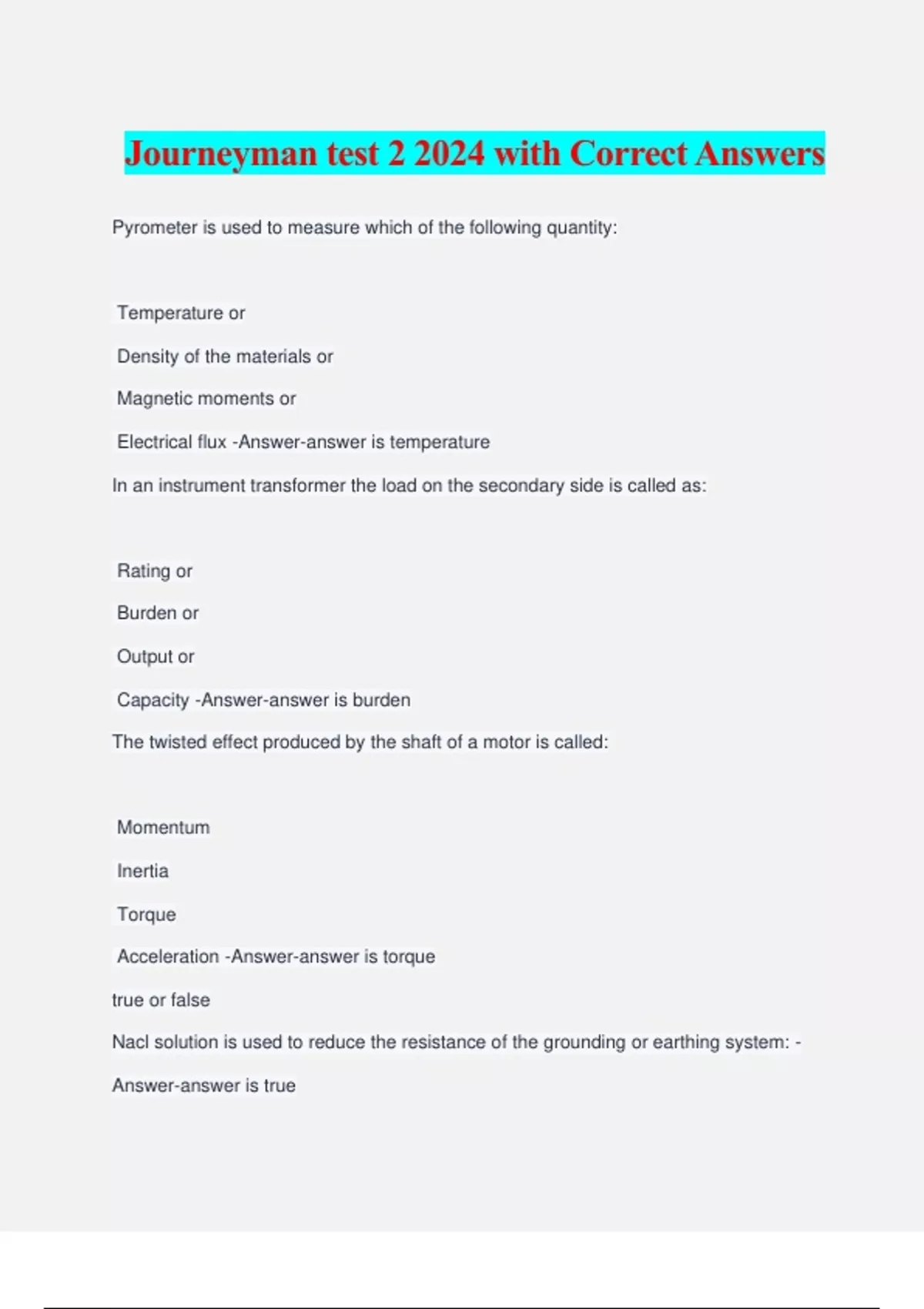 Journeyman test 2 2024 with Correct Answers Pyrometer is used to measure which of the following quantity: Temperature or Density of the materials or Magnetic moments or Electrical flux -Answer-answer is temperature In an instrument transformer the load on the secondary side is called as: Rating or Burden or Output or Capacity -Answer-answer is burden The twisted effect produced by the shaft of a motor is called: Momentum Inertia Torque Acceleration -Answer-answer is torque true or false Nacl solution is used to reduce the resistance of the grounding or earthing system: - Answer-answer is true