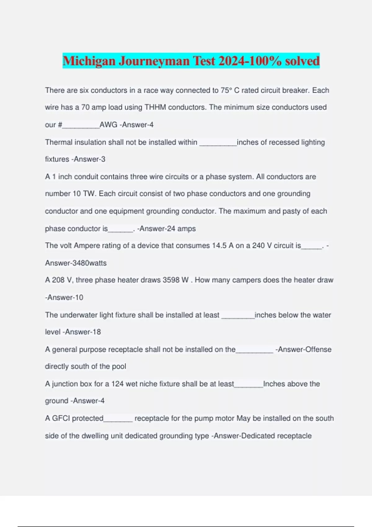 Michigan Journeyman Test 2024-100% solved There are six conductors in a race way connected to 75° C rated circuit breaker. Each wire has a 70 amp load using THHM conductors. The minimum size conductors used our #_________AWG -Answer-4 Thermal insulation shall not be installed within _________inches of recessed lighting fixtures -Answer-3 A 1 inch conduit contains three wire circuits or a phase system. All conductors are number 10 TW. Each circuit consist of two phase conductors and one grounding conductor and one equipment grounding conductor. The maximum and pasty of each phase conductor is______. -Answer-24 amps The volt Ampere rating of a device that consumes 14.5 A on a 240 V circuit is_____. - Answer-3480watts A 208 V, three phase heater draws 3598 W . How many campers does the heater draw -Answer-10 The underwater light fixture shall be installed at least ________inches below the water level -Answer-18 A general purpose receptacle shall not be installed on the_________ -Answer-Offense directly south of the pool A junction box for a 124 wet niche fixture shall be at least_______Inches above the ground -Answer-4 A GFCI protected_______ receptacle for the pump motor May be installed on the south side of the dwelling unit dedicated grounding type -Answer-Dedicated receptacle A metal fence installed within________Feet of a pool Shall be bonded -Answer-5 The feed to the wet niche fixture shall be installed in -Answer-Rigid brass A 15 or 20 amp receptacle Shall be located within_____Feet of a rooftop air conditioner -Answer-25 In a commercial building the minimum size ungrounded service entrance conductor for 120 Dash 240 V single phase 200 amp service is -Answer-3/0 thwn copper The minimum service for a one family dwelling Shall be -Answer-100amps Type _____ Cable is not permitted for service entrance conductors -Answer-UF A comb rated 4750 W , 208 V 3 phase draws ________ amps -Answer-13.2 Direct burial cable emerging from the ground and subject to physical damage shall be installed in_________. -Answer-Schedule 80 PVC