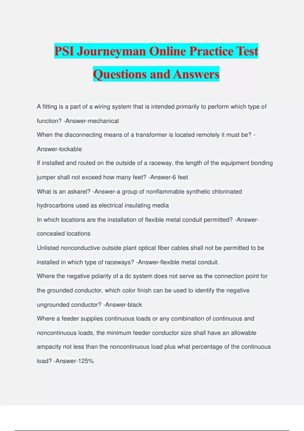 PSI Journeyman Online Practice Test Questions and Answers A fitting is a part of a wiring system that is intended primarily to perform which type of function? -Answer-mechanical When the disconnecting means of a transformer is located remotely it must be? - Answer-lockable If installed and routed on the outside of a raceway, the length of the equipment bonding jumper shall not exceed how many feet? -Answer-6 feet What is an askarel? -Answer-a group of nonflammable synthetic chlorinated hydrocarbons used as electrical insulating media In which locations are the installation of flexible metal conduit permitted? -Answer- concealed locations Unlisted nonconductive outside plant optical fiber cables shall not be permitted to be installed in which type of raceways? -Answer-flexible metal conduit. Where the negative polarity of a dc system does not serve as the connection point for the grounded conductor, which color finish can be used to identify the negative ungrounded conductor? -Answer-black Where a feeder supplies continuous loads or any combination of continuous and noncontinuous loads, the minimum feeder conductor size shall have an allowable ampacity not less than the noncontinuous load plus what percentage of the continuous load? -Answer-125% Where an ac system is grounded at any point, the grounded conductors shall be routed with the ungrounded conductors to each service disconnecting means and shall be connected to each disconnecting means grounded conductors terminal or bus for an ac system operating at how many volts? -Answer-1,000 volts or less What is the maximum spacing for supports of 10 AWG copper conductors located in a vertical raceway? -Answer-100 feet What is the maximum overcurrent protection for a 10 AWG copper conductor? -Answer- 30 amperes A circuit breaker does not have an interrupter rating shown on it. What is the interrupter rating of this circuit breaker? -Answer-5,000 amperes Dry-type transformers rated over which voltage shall be installed in a vault? -Answer- 35,000 volts A panelboard for a mobile home shall be rated not less than which of the following? - Answer-50 amperes An electrical appliance is rated at 1,500 watts, and is connected to 120 volts. What is the resistance associated with this appliance? -Answer-9.6 ohms High-impedance grounded neutral systems in which a grounding impedance limits the ground fault current to a low value shall be permitted for which type of system? - Answer-3-phase ac systems of 480 volts to 1,000 volts Where the positive polarity of a dc system does not serve as the connection for the grounded conductor, which color finish can be used to identify the positive ungrounded conductor? -Answer-red