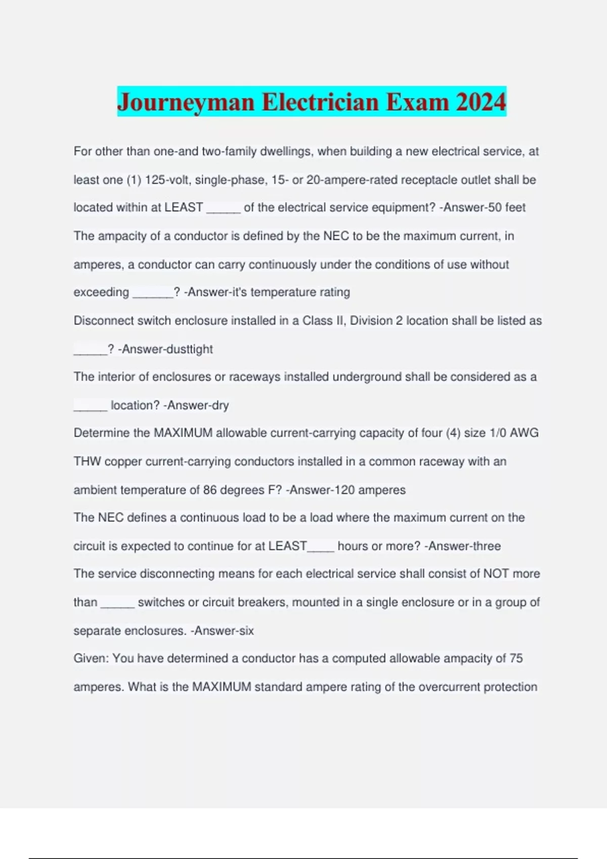 Journeyman Electrician Exam 2024 For other than one-and two-family dwellings, when building a new electrical service, at least one (1) 125-volt, single-phase, 15- or 20-ampere-rated receptacle outlet shall be located within at LEAST _____ of the electrical service equipment? -Answer-50 feet The ampacity of a conductor is defined by the NEC to be the maximum current, in amperes, a conductor can carry continuously under the conditions of use without exceeding ______? -Answer-it's temperature rating Disconnect switch enclosure installed in a Class II, Division 2 location shall be listed as _____? -Answer-dusttight The interior of enclosures or raceways installed underground shall be considered as a _____ location? -Answer-dry Determine the MAXIMUM allowable current-carrying capacity of four (4) size 1/0 AWG THW copper current-carrying conductors installed in a common raceway with an ambient temperature of 86 degrees F? -Answer-120 amperes The NEC defines a continuous load to be a load where the maximum current on the circuit is expected to continue for at LEAST____ hours or more? -Answer-three The service disconnecting means for each electrical service shall consist of NOT more than _____ switches or circuit breakers, mounted in a single enclosure or in a group of separate enclosures. -Answer-six Given: You have determined a conductor has a computed allowable ampacity of 75 amperes. What is the MAXIMUM standard ampere rating of the overcurrent protection device the NEC® permits to protect this circuit where this is not a motor circuit or part of a multioutlet branch circuit supplying more than one receptacle? -Answer-80 amperes A 208-volt, 3-phase, 50 hp, squirrel-cage, continuous-duty, ac motor has a full-load running current rating of _____? -Answer-143 amperes What is the MAXIMUM distance that a disconnect switch is permitted to be located from the operator's station for a portable carnival ride? -Answer-6 feet Determine the MINIMUM trade size electrical metallic tubing (EMT) required to enclose eight (8) size 6 AWG copper conductors with THHW insulation, when installed in a 50 foot conduit run? -Answer-1 1/4 in. Where exceptions are not applicable, when a feeder supplies a continuous load of 240 amperes, the overcurrent protection device protecting this circuit shall have a rating of at LEAST _____? -Answer-300 amperes Liquidtight flexible metal conduit (LFMC) shall be securely fastened WITHIN _____ of each box or other conduit termination? -Answer-12 inches