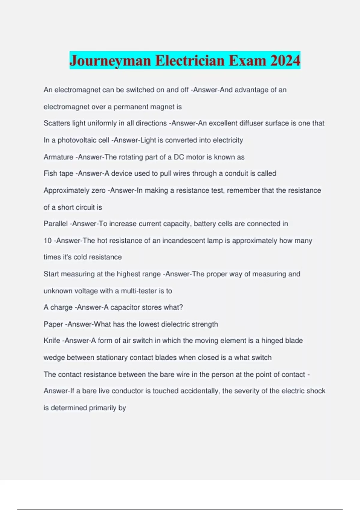 Journeyman Electrician Exam 2024 An electromagnet can be switched on and off -Answer-And advantage of an electromagnet over a permanent magnet is Scatters light uniformly in all directions -Answer-An excellent diffuser surface is one that In a photovoltaic cell -Answer-Light is converted into electricity Armature -Answer-The rotating part of a DC motor is known as Fish tape -Answer-A device used to pull wires through a conduit is called Approximately zero -Answer-In making a resistance test, remember that the resistance of a short circuit is Parallel -Answer-To increase current capacity, battery cells are connected in 10 -Answer-The hot resistance of an incandescent lamp is approximately how many times it's cold resistance Start measuring at the highest range -Answer-The proper way of measuring and unknown voltage with a multi-tester is to A charge -Answer-A capacitor stores what? Paper -Answer-What has the lowest dielectric strength Knife -Answer-A form of air switch in which the moving element is a hinged blade wedge between stationary contact blades when closed is a what switch The contact resistance between the bare wire in the person at the point of contact - Answer-If a bare live conductor is touched accidentally, the severity of the electric shock is determined primarily by The same as -Answer-The voltage per turn of the primary of a transformer is ________the voltage per turn of the secondary Infinite -Answer-And open resister when checked with an ohmmeter reads Lesser -Answer-The larger the diameter of a wire, the _____is it's resistance? Above -Answer-Service heads and goosenecks in service entrance cable shall be what point of attachment of the service drops to the building?