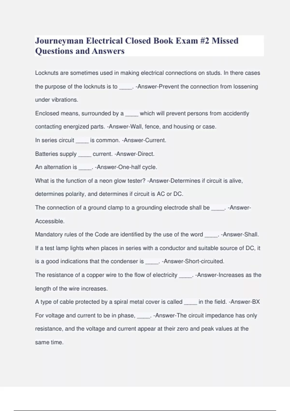 Journeyman Electrical Closed Book Exam #2 Missed Questions and Answers Locknuts are sometimes used in making electrical connections on studs. In there cases the purpose of the locknuts is to ____. -Answer-Prevent the connection from lossening under vibrations. Enclosed means, surrounded by a ____ which will prevent persons from accidently contacting energized parts. -Answer-Wall, fence, and housing or case. In series circuit ____ is common. -Answer-Current. Batteries supply ____ current. -Answer-Direct. An alternation is ____. -Answer-One-half cycle. What is the function of a neon glow tester? -Answer-Determines if circuit is alive, determines polarity, and determines if circuit is AC or DC. The connection of a ground clamp to a grounding electrode shall be ____. -Answer- Accessible. Mandatory rules of the Code are identified by the use of the word ____. -Answer-Shall. If a test lamp lights when places in series with a conductor and suitable source of DC, it is a good indications that the condenser is ____. -Answer-Short-circuited. The resistance of a copper wire to the flow of electricity ____. -Answer-Increases as the length of the wire increases.