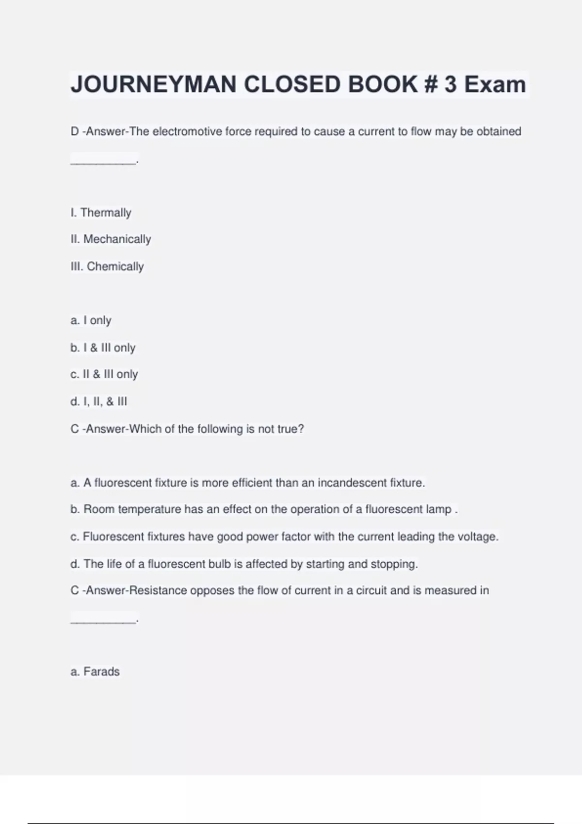 JOURNEYMAN CLOSED BOOK # 3 Exam D -Answer-The electromotive force required to cause a current to flow may be obtained __________. I. Thermally II. Mechanically III. Chemically a. I only b. I & III only c. II & III only d. I, II, & III C -Answer-Which of the following is not true? a. A fluorescent fixture is more efficient than an incandescent fixture. b. Room temperature has an effect on the operation of a fluorescent lamp . c. Fluorescent fixtures have good power factor with the current leading the voltage. d. The life of a fluorescent bulb is affected by starting and stopping. C -Answer-Resistance opposes the flow of current in a circuit and is measured in __________. a. Farads b. Joules c. Ohms d. Henrys C -Answer-Which of the following is true? a. Wooden plugs may be used for mounting electrical equipment in concrete. b. The high-leg conductor of a 4-wire delta is identified blue in color. c. The minimum size service permitted by the Code for a residence is 100 amps. d. The ungrounded conductor is connected to the screw shell of a lampholder. B -Answer-Mulitple start buttons in a motor control circuit are connected in __________. a. Series b. Parallel c. Series-parallel d. None of these B -Answer-Which of the following is not true? a. Feeder demand factors are applicable to household electric ranges. b. A green colored conductor can be used as an ungrounded circuit conductor. c. Insulated conductors #6 or smaller shall be white or gray, no marking tape permitted. d. All joints or splices must be electrically and mechanically secure before soldering. D -Answer-Special permission is __________. a. Granted by the electrical foreman on the job. b. Verbal permission by the inspector. c. Given only once on one blueprint change request. d. The written consent of the authority having jurisdiction. C -Answer-One million volts can also expressed as __________. a. 1 millivolt b. 1 kilovolt c. 1 megavolt d. 1 microvolt C -Answer-Resistance in a circuit may be __________. I. Resistance of the conductors II. Resistance due to imperfect contact a. I only b. II only c. Both I & II d. Neither I nor II C -Answer-Which of the following is not true? a. All receptacles on 15 and 20 amp branch circuits must be of the grounding type. b. Splices and joints shall be covered with an insulation equivalent to the conductor insulation