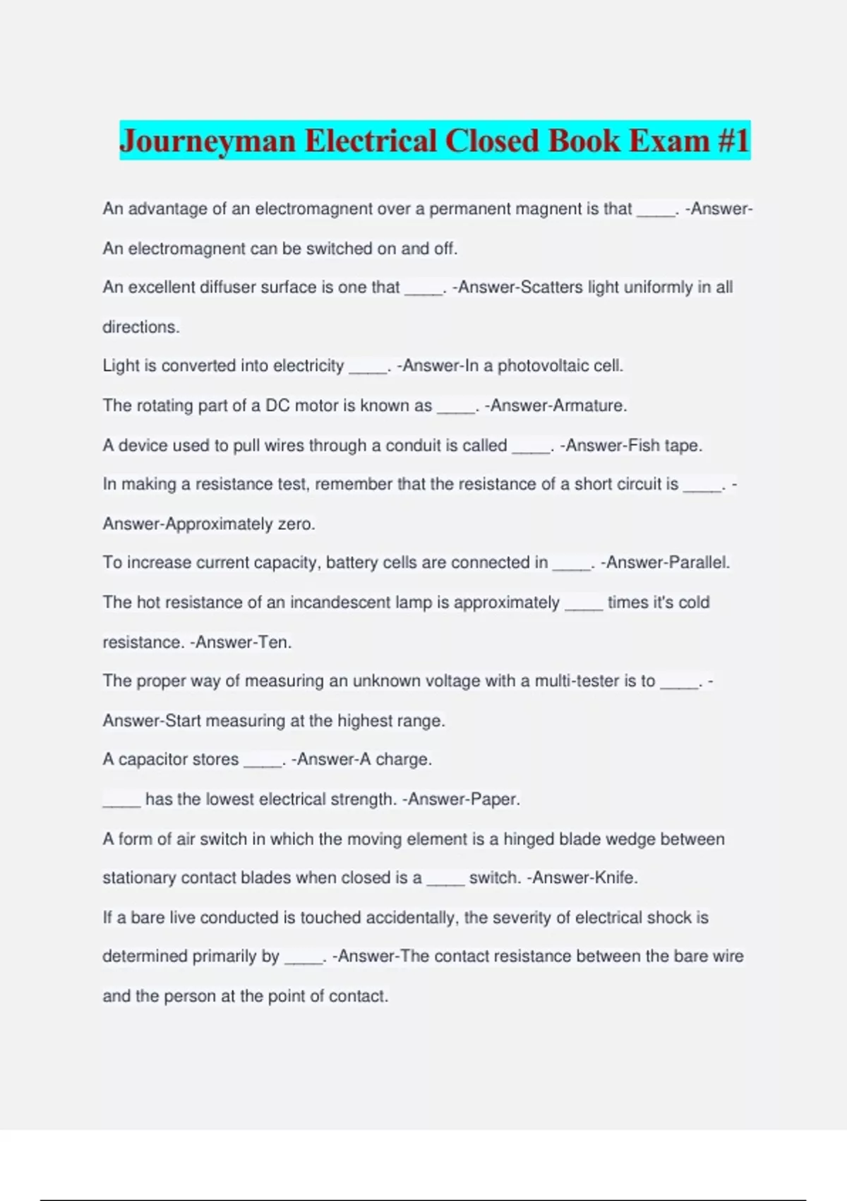 Journeyman Electrical Closed Book Exam #1 An advantage of an electromagnent over a permanent magnent is that ____. -Answer- An electromagnent can be switched on and off. An excellent diffuser surface is one that ____. -Answer-Scatters light uniformly in all directions. Light is converted into electricity ____. -Answer-In a photovoltaic cell. The rotating part of a DC motor is known as ____. -Answer-Armature. A device used to pull wires through a conduit is called ____. -Answer-Fish tape. In making a resistance test, remember that the resistance of a short circuit is ____. - Answer-Approximately zero. To increase current capacity, battery cells are connected in ____. -Answer-Parallel. The hot resistance of an incandescent lamp is approximately ____ times it's cold resistance. -Answer-Ten. The proper way of measuring an unknown voltage with a multi-tester is to ____. - Answer-Start measuring at the highest range. A capacitor stores ____. -Answer-A charge. ____ has the lowest electrical strength. -Answer-Paper. A form of air switch in which the moving element is a hinged blade wedge between stationary contact blades when closed is a ____ switch. -Answer-Knife. If a bare live conducted is touched accidentally, the severity of electrical shock is determined primarily by ____. -Answer-The contact resistance between the bare wire and the person at the point of contact