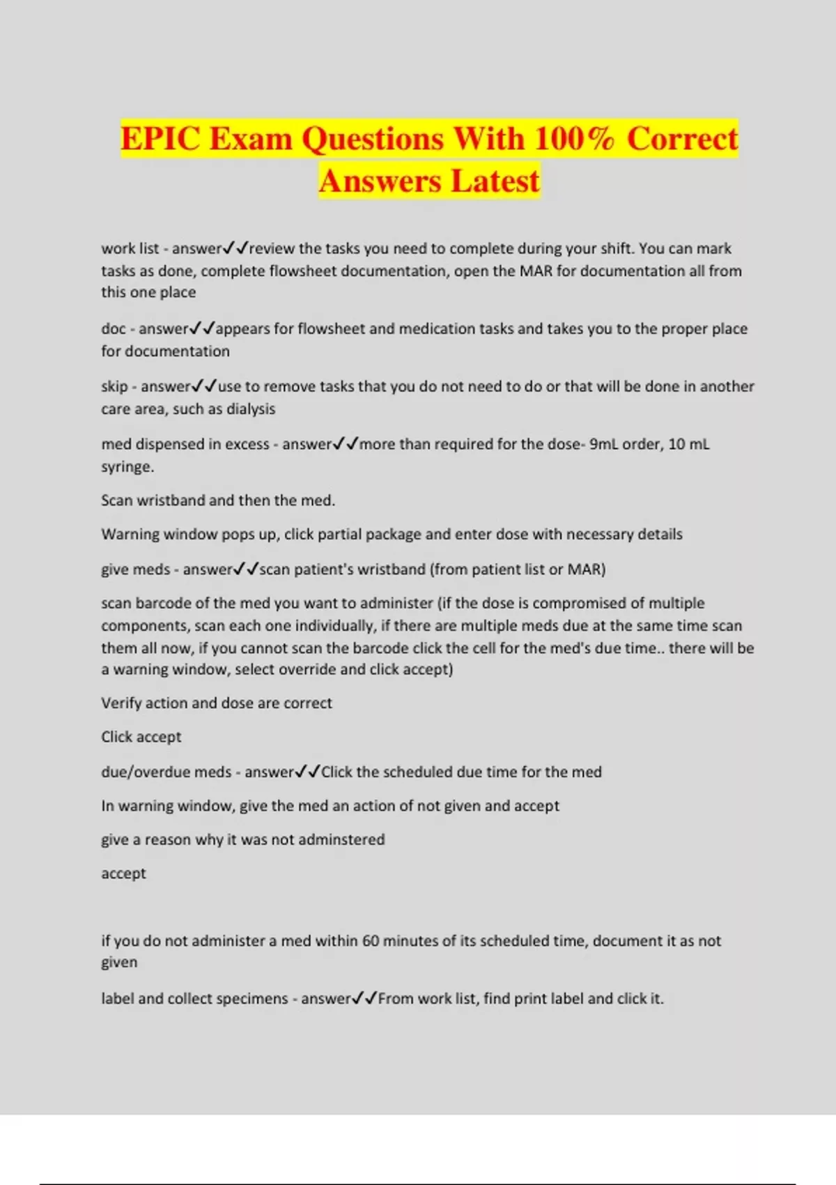 EPIC Exam Questions With 100% Correct Answers Latest work list - answerreview the tasks you need to complete during your shift. You can mark tasks as done, complete flowsheet documentation, open the MAR for documentation all from this one place doc - answerappears for flowsheet and medication tasks and takes you to the proper place for documentation skip - answeruse to remove tasks that you do not need to do or that will be done in another care area, such as dialysis med dispensed in excess - answermore than required for the dose- 9mL order, 10 mL syringe. Scan wristband and the