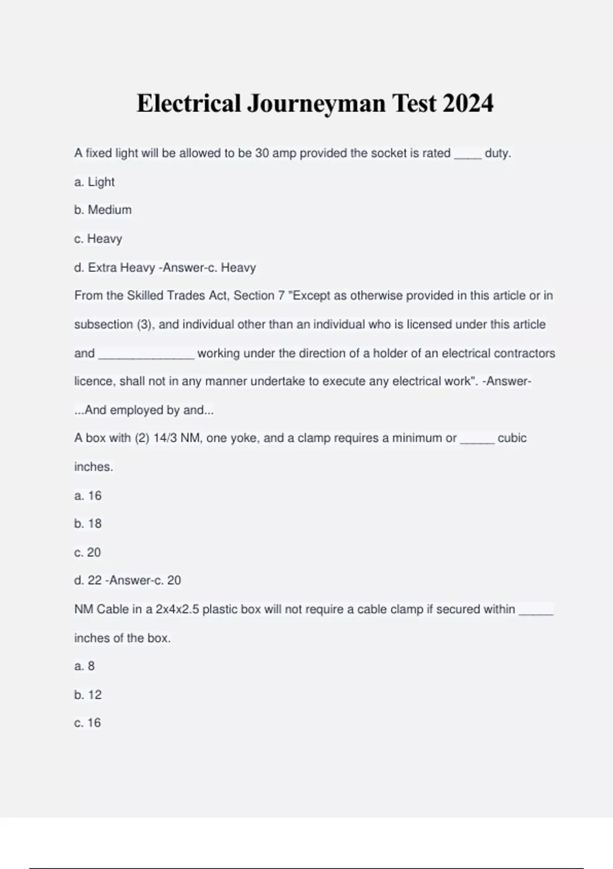 Electrical Journeyman Test 2024 A fixed light will be allowed to be 30 amp provided the socket is rated ____ duty. a. Light b. Medium c. Heavy d. Extra Heavy -Answer-c. Heavy From the Skilled Trades Act, Section 7 "Except as otherwise provided in this article or in subsection (3), and individual other than an individual who is licensed under this article and ______________ working under the direction of a holder of an electrical contractors licence, shall not in any manner undertake to execute any electrical work". -Answer- ...And employed by and... A box with (2) 14/3 NM, one yoke, and a clamp requires a minimum or _____ cubic inches. a. 16 b. 18 c. 20 d. 22 -Answer-c. 20 NM Cable in a 2x4x2.5 plastic box will not require a cable clamp if secured within _____ inches of the box. a. 8 b. 12 c. 16 d. 20 -Answer-a. 8 A box with #10 AWG THHN will require a free space of _____inches. a. 2 b. 2.25 c. 2.5 d. 3 -Answer-c. 2.5 (See Table 314.16 (B).) A mobile home with 100 amp service will require service conductors of ____ AWG. a. #4 b. #3 c. #2 d. #1 -Answer-a. #4 (See 550.33 (B) and 310.15 (B)(7).) A service with (4) 4" PVC conduits with (4) 800KCMIL feeder in each will require a main bonding jumper of what AWG? a. 4/0 b. 1/0 c. 250 KCMIL d. 500 KCMIL -Answer-d. 500 KCMIL (See Table 250.102 (C)(1) and Chapter 9 Table 8 A conduit protecting the grounding electrode conductor shall be bonded to the ____ at both ends. -Answer-Grounding Electrode Conductor (See 250.66(E)(1).) A grounding electrode encased in concrete shall be _____ft long and _____ in circumference. a. 8ft, 5/8" b. 12ft, 1⁄2" c. 20ft, 1⁄2" d. Something else... -Answer-c. 20ft, 1⁄2" (See 250.52(A)(3).) The required outlet for an in-ground pool shall be mounted _____ a. On the wall of a building 21 feet from waters edge b. On a balcony 8 feet above water level c. On a support 3 feet from waters edge d. On a post 6'6" above grade level -Answer-d. On a post 6'6" above grade level (See 680.22(A)(1).) Permanently installed pool motors shall have a cord length of_____ a. 3ft b. 6ft c. 12ft d. 20ft -Answer-a. 3ft (See 680.21 (A)(3).) The conductor feeding a wet-niche pool light will be _____ a. Electrical Metallic Conduit b. Rigid conduit made of brass c. Flexible metallic conduit d. Something else..... -Answer-b. Rigid conduit made of brass (See 680.23(B)(2) and (B)(2)(a).) Which conductor is not allowed to be used as a service conductor? a. USE b. MC Cable c. Underground Feeder d. MI Cable -Answer-c. Underground Feeder (See 338.12 (B) What is the % conduit fill used in a nipple that does not exceed 24" -Answer-A: 60% (see chapter 9 table 1 note (4).) Car Wash Receptacle must be -Answer-WR Weather Resistant (see 406.9 (B)(1).) Overhead Service conductor clearance for pedestrian walkway -Answer-10' (see 230.24 (B)(1).) Snap switch used for motor must not exceed -Answer-80% of the amp rating of the switch (see 404.14 (A)(3).) Max amperage of Edison based fuse -Answer-30A (see 240.51 (A).) What can you put on a small appliance circuit. -Answer-Receptacles for a gas fired range, oven, or countertop cooking unit (see 210.52 (B)(2) Exception 2) Type of branch circuit needed for a furnace or other central heating equipment -Answer- Individual Branch Circuit (see 422.12) Receptacle serving AC or refrigeration equipment -Answer-Required within 25' (see 210.63) Minimum size hand-hole in a pole supporting a luminaire -Answer-2" X 4" (see 410.30 (B)(1).) Laundry room branch circuit shall be -Answer-Dedicated (see210.11 (C)(2).) A receptacle supplying power to a furnace, is required to be powered by what type of electrical circuit. -Answer-An INDIVIDUAL circuit What is the required minimum wire size for a ground ring -Answer-#2 American Wire Gage (AWG)