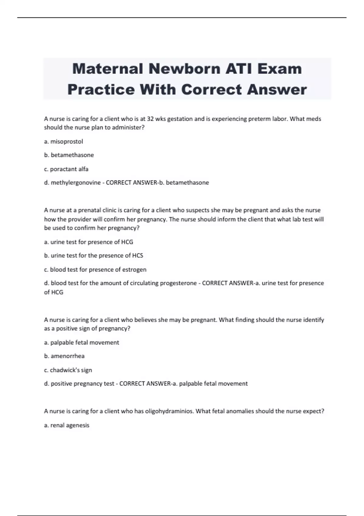 Maternal Newborn ATI Exam Practice With Correct Answer A nurse is caring for a client who is at 32 wks gestation and is experiencing preterm labor. What meds should the nurse plan to administer? a. misoprostol b. betamethasone c. poractant alfa d. methylergonovine - CORRECT ANSWER-b. betamethasone A nurse at a prenatal clinic is caring for a client who suspects she may be pregnant and asks the nurse how the provider will confirm her pregnancy. The nurse should inform the client that what lab test will be used to confirm her pregnancy? a. urine test for presence of HCG b. urine test for the presence of HCS c. blood test for presence of estrogen d. blood test for the amount of circulating progesterone - CORRECT ANSWER-a. urine test for presence of HCG