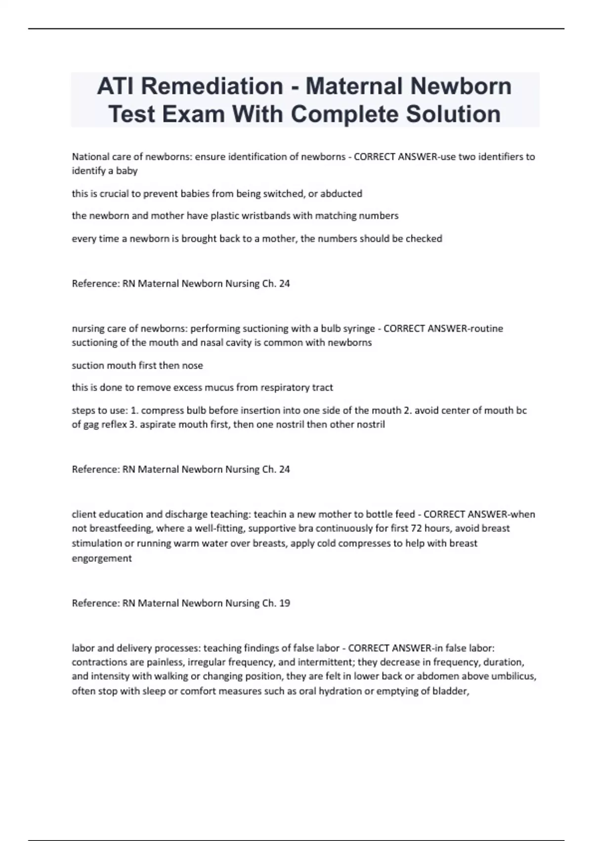 TI Remediation - Maternal Newborn Test Exam With Complete Solution National care of newborns: ensure identification of newborns - CORRECT ANSWER-use two identifiers to identify a baby this is crucial to prevent babies from being switched, or abducted the newborn and mother have plastic wristbands with matching numbers every time a newborn is brought back to a mother, the numbers should be checked Reference: RN Maternal Newborn Nursing Ch. 24 nursing care of newborns: performing suctioning with a bulb syringe - CORRECT ANSWER-routine suctioning of the mouth and nasal cavity is common with newborns suction mouth first then nose this is done to remove excess mucus from respiratory tract steps to use: 1. compress bulb before insertion into one side of the mouth 2. avoid center of mouth bc of gag reflex 3. aspirate mouth first, then one nostril then other nostri