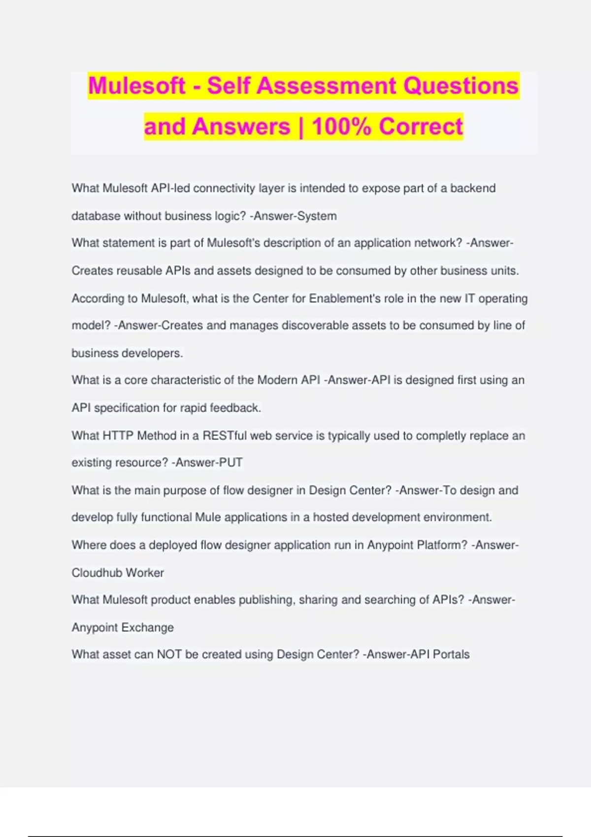Mulesoft - Self Assessment Questions and Answers | 100% Correct What Mulesoft API-led connectivity layer is intended to expose part of a backend database without business logic? -Answer-System What statement is part of Mulesoft's description of an application network? -Answer- Creates reusable APIs and assets designed to be consumed by other business units. According to Mulesoft, what is the Center for Enablement's role in the new IT operating model? -Answer-Creates and manages discoverable assets to be consumed by line of business developers. What is a core characteristic of the Modern API -Answer-API is designed first using an API specification for rapid feedback. What HTTP Method in a RESTful web service is typically used to completly replace an existing resource? -Answer-PUT What is the main purpose of flow designer in Design Center? -Answer-To design and develop fully functional Mule applications in a hosted development environment. Where does a deployed flow designer application run in Anypoint Platform? -Answer- Cloudhub Worker What Mulesoft product enables publishing, sharing and searching of APIs? -Answer- Anypoint Exchange What asset can NOT be created using Design Center? -Answer-API Portals A web client submits a GET request to a Mule 4 application to the enpoint /customers?id=48493. Where is the id stored in the Mule event by the HTTP listener? - Answer-attributes An API has been created in Design Center. What is the next step to make the API discoverable? -Answer-Publish the API to Anypoint Exchange. Refer to the exhibit. What is the correct URL to submit a GET request to/patients? /patients: get: queryParameters: year: type: integer example: 2017 -Answer- A RAML example fragment named BankAccountsE is placed in the examples folder in an API specification project. What is the correct syntax to reference the fragment? -Answer-examples: !include examples/BankAccountsE Refer to the exhibit. There is an error in the flight_id resource's GET method. What needs to be done to fix the problem? /flights: get: /{flights_id}: get: -Answer-Indent the get method under the {flight_id} resource. Refer to the exhibit. This RAML specification includes an XML example that matches the Records data type defined in another RAML file named recordsDataT. Using the Records type, how can this XML example be represented in RAML? <music> <collection>Deep Collection</collection> <artists> <artist1>Deep Purple</artist1> <artist2>Rainbox</artist2> </artists> </music> -Answer-body