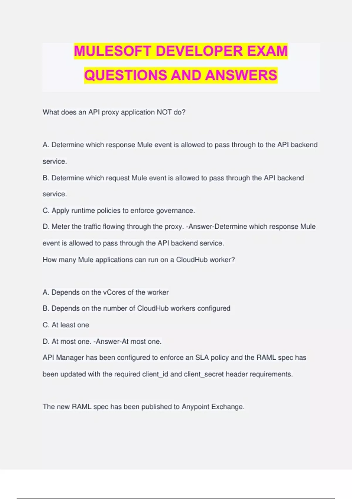 MULESOFT DEVELOPER EXAM QUESTIONS AND ANSWERS What does an API proxy application NOT do? A. Determine which response Mule event is allowed to pass through to the API backend service. B. Determine which request Mule event is allowed to pass through the API backend service. C. Apply runtime policies to enforce governance. D. Meter the traffic flowing through the proxy. -Answer-Determine which response Mule event is allowed to pass through the API backend service. How many Mule applications can run on a CloudHub worker? A. Depends on the vCores of the worker B. Depends on the number of CloudHub workers configured C. At least one D. At most one. -Answer-At most one. API Manager has been configured to enforce an SLA policy and the RAML spec has been updated with the required client_id and client_secret header requirements. The new RAML spec has been published to Anypoint Exchange. What is the next step to gain access to the API? A.) POST a JSON object to the /api/register endpoint of the API proxy B.) Request access to the API in Anypoint Exchange C.) Email the organization administrators to request access to the API D. ) Add a client application to the Anypoint Platform organization -Answer-Request access to the API in Anypoint Exchang