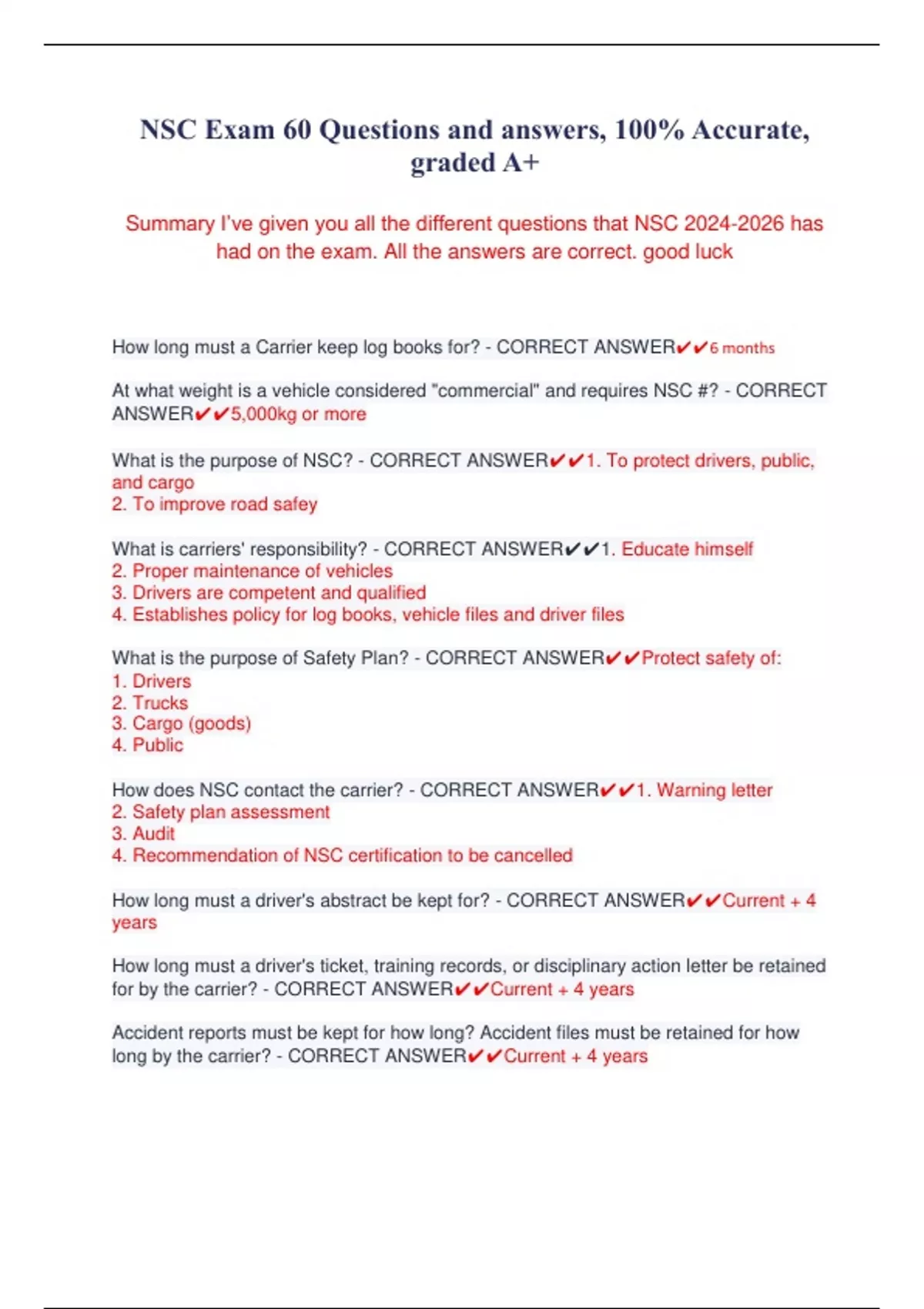 NSC Exam Questions and answers, 100% Accurate, graded A+ Summary I’ve given you all the different questions that NSC has had on the exam. All the answers are correct. good luck