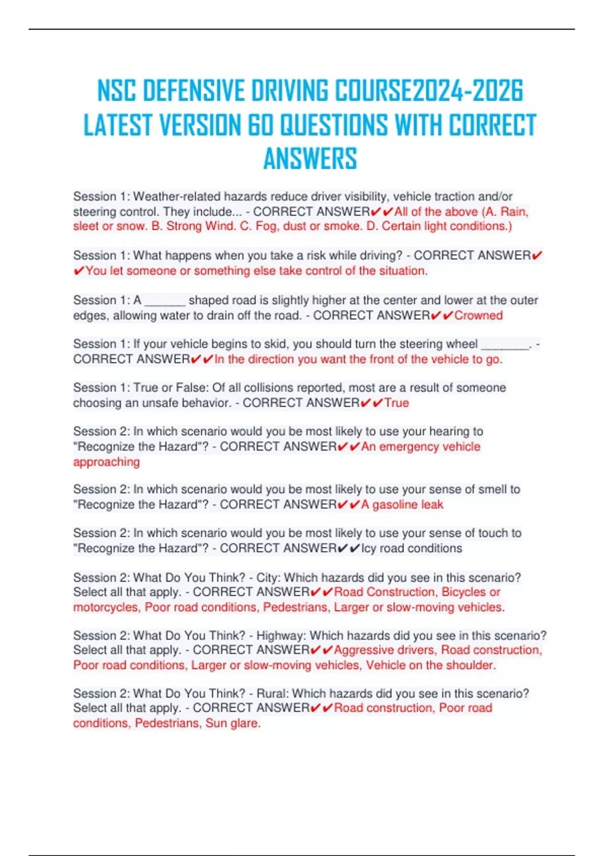NSC DEFENSIVE DRIVING COURSE LATEST VERSION 60 QUESTIONS WITH CORRECT ANSWERS