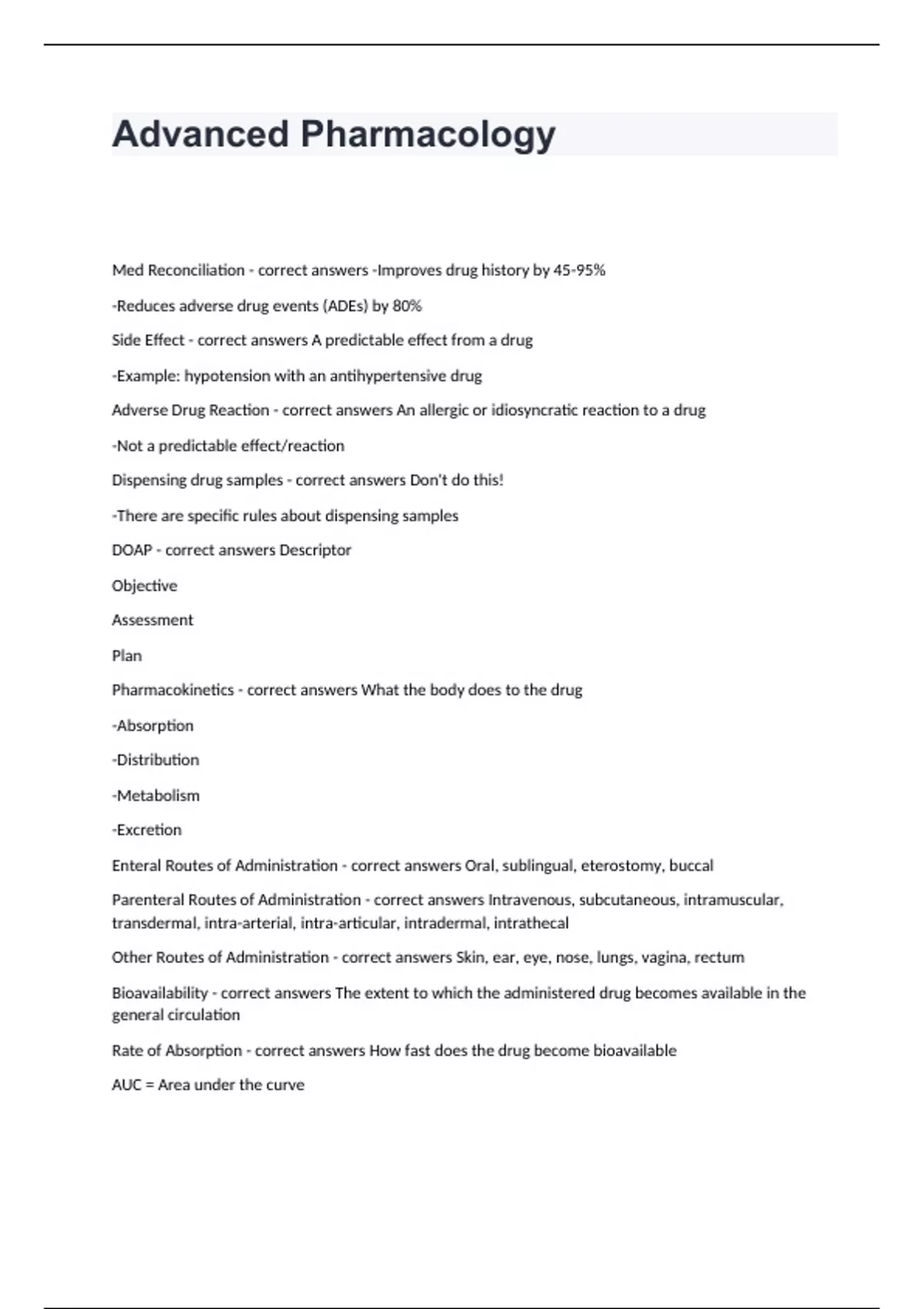 Advanced Pharmacology Med Reconciliation - correct answers -Improves drug history by 45-95% -Reduces adverse drug events (ADEs) by 80% Side Effect - correct answers A predictable effect from a drug -Example: hypotension with an antihypertensive drug Adverse Drug Reaction - correct answers An allergic or idiosyncratic reaction to a drug -Not a predictable effect/reaction Dispensing drug samples - correct answers Don't do this! -There are specific rules about dispensing samples DOAP - correct answers Descriptor Objective Assessment Plan Pharmacokinetics - correct answers What the body does to the drug -Absorption -Distribution -Metabolism -Excretion Enteral Routes of Administration - correct answers Oral, sublingual, eterostomy, buccal Parenteral Routes of Administration - correct answers Intravenous, subcutaneous, intramuscular, transdermal, intra-arterial, intra-articular, intradermal, intrathecal Other Routes of Administration - correct answers Skin, ear, eye, nose, lungs, vagina, rectum Bioavailability - correct answers The extent to which the administered drug becomes available in the general circulation Rate of Absorption - correct answers How fast does the drug become bioavailable AUC = Area under the curve