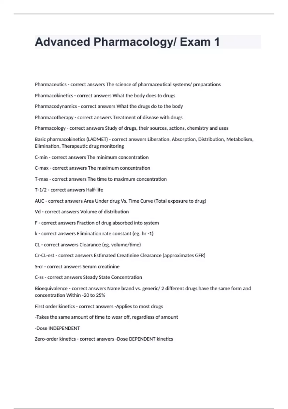 Advanced Pharmacology/ Exam 1 Pharmaceutics - correct answers The science of pharmaceutical systems/ preparations Pharmacokinetics - correct answers What the body does to drugs Pharmacodynamics - correct answers What the drugs do to the body Pharmacotherapy - correct answers Treatment of disease with drugs Pharmacology - correct answers Study of drugs, their sources, actions, chemistry and uses Basic pharmacokinetics (LADMET) - correct answers Liberation, Absorption, Distribution, Metabolism, Elimination, Therapeutic drug monitoring C-min - correct answers The minimum concentration C-max - correct answers The maximum concentration T-max - correct answers The time to maximum concentration T-1/2 - correct answers Half-life AUC - correct answers Area Under drug Vs. Time Curve (Total exposure to drug) Vd - correct answers Volume of distribution F - correct answers Fraction of drug absorbed into system k - correct answers Elimination rate constant (eg. hr -1) CL - correct answers Clearance (eg. volume/time) Cr-CL-est - correct answers Estimated Creatinine Clearance (approximates GFR) S-cr - correct answers Serum creatinine C-ss - correct answers Steady State Concentration Bioequivalence - correct answers Name brand vs. generic/ 2 different drugs have the same form and concentration Within -20 to 25% First order kinetics - correct answers -Applies to most drugs -Takes the same amount of time to wear off, regardless of amount -Dose INDEPENDENT Zero-order kinetics - correct answers -Dose DEPENDENT kinetics