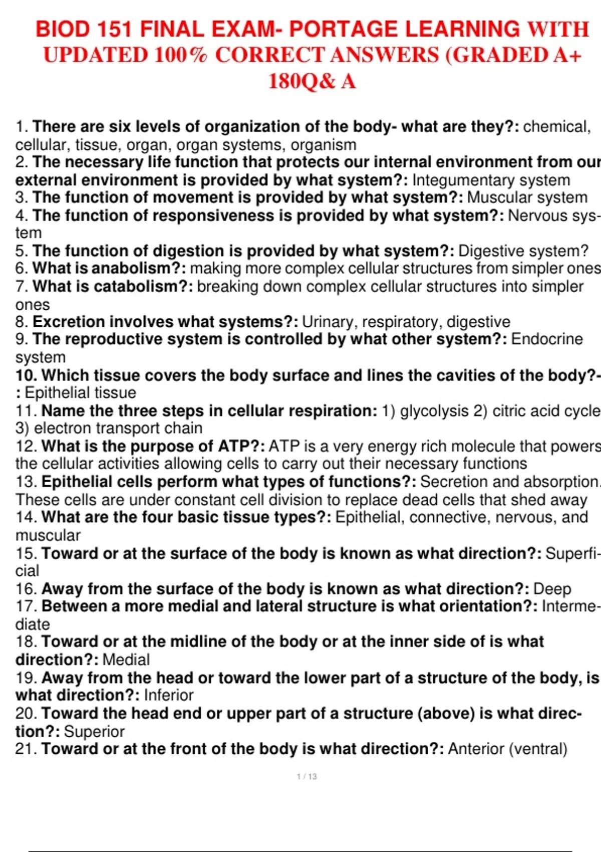 BIOD 151 FINAL EXAM- PORTAGE LEARNING WITH UPDATED 100% CORRECT ANSWERS (GRADED A+ 180Q& A