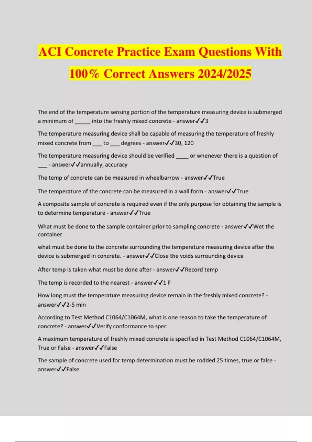 ACI Concrete Practice Exam Questions With 100% Correct Answers 2024/2025 The end of the temperature sensing portion of the temperature measuring device is submerged a minimum of _____ into the freshly mixed concrete - answer3 The temperature measuring device shall be capable of measuring the temperature of freshly mixed concrete from ___ to ___ degrees - answer30, 120 The temperature measuring device should be verified ____ or whenever there is a question of ___ - answerannually, accuracy The temp of concrete can be measured in wheelbarrow - answerTrue The temperature of the concrete can be measured in a wall form - answerTrue A composite sample of concrete is required even if the only purpose for obtaining the sample is to determine temperature - answerTrue What must be done to the sample container prior to sampling concrete - answerWet the container what must be done to the concrete surrounding the temperature measuring device after the device is submerged in concrete. - answerClose the voids surrounding device After temp is taken what must be done after - answerRecord temp The temp is recorded to the nearest - answer1 F How long must the temperature measuring device remain in the freshly mixed concrete? - answer2-5 min According to Test Method C1064/C1064M, what is one reason to take the temperature of concrete? - answerVerify conformance to spec A maximum temperature of freshly mixed concrete is specified in Test Method C1064/C1064M, True or False - answerFalse The sample of concrete used for temp determination must be rodded 25 times, true or false - answerFalse Sampling by this practice covers procedures for obtaining representative samples, on which tests are to be performed to determine ___ with quality requirements of the specifications under which the concrete is furnished. - answerCompliance This practice covers sampling from five types of equipment, which are ___________, ___________, __________, __________, and __________. - answerStationary, Paving, Revolving Drum, Continuous, Open Top The elapsed time between obtaining the first and final portions of a composite sample shall not exceed _____ minutes. - answer15 Portions of a composite sample shall be throughly remixed before beginning tests on the sample - answerTrue Start the tests for slump, temperature, and air content within how many minutes after obtaining the final portion of the composite sample? - answer5 Start molding specimens for strength tests within how many minutes after fabricating the composite sample? - answer15