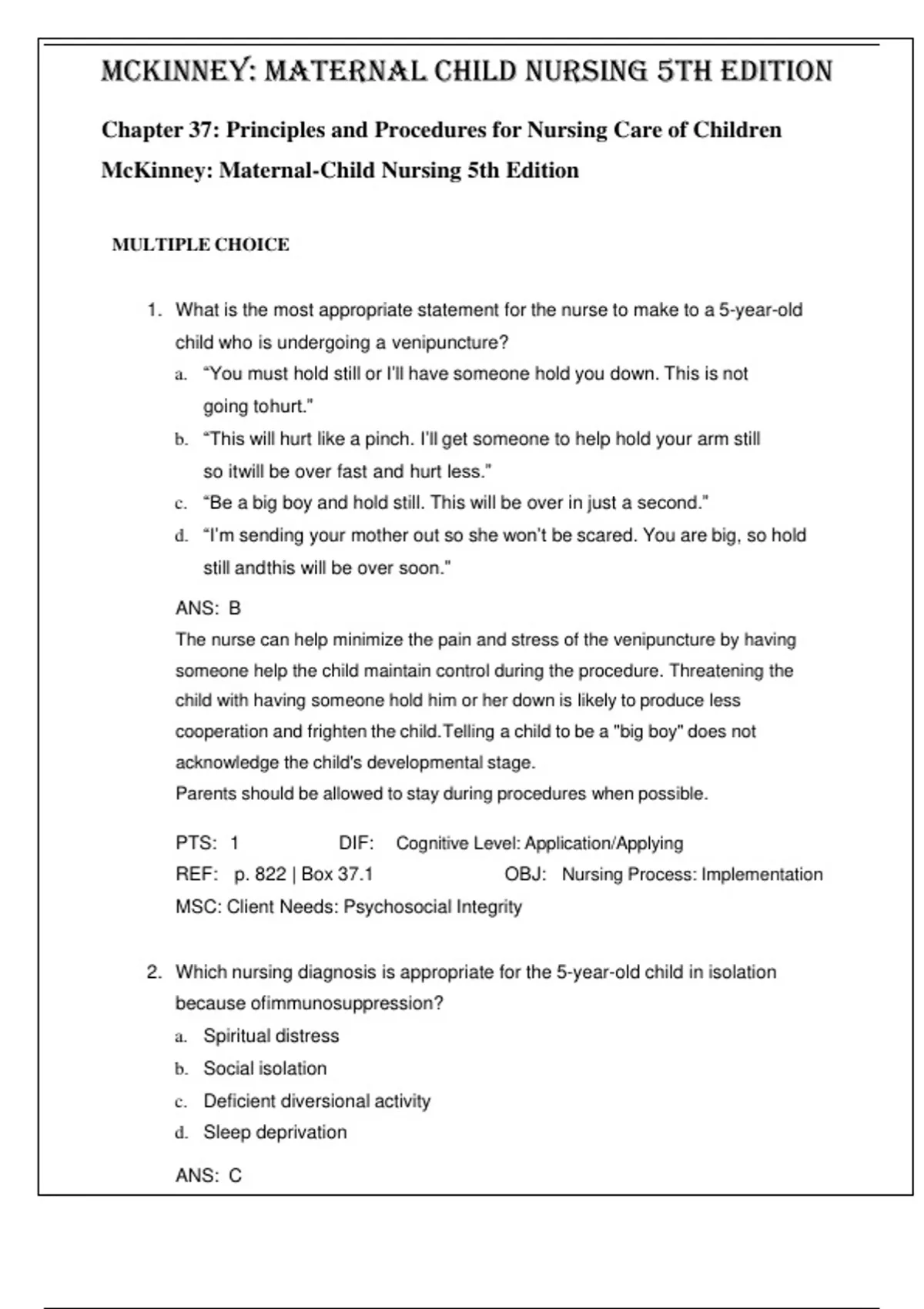 Maternal Child Nursing 5th Edition by McKinney- ISBN- 978-0323401708 TEST BANK Chapter 37: Principles and Procedures for Nursing Care of Children Verified 2024 Practice Questions and 100% Correct Answers with Explanations for Exam Preparation, Graded A+ What is the most appropriate statement for the nurse to make to a 5-year-old child who is undergoing a venipuncture? a. “You must hold still or I’ll have someone hold you down. This is not going tohurt.” b. “This will hurt like a pinch. I’ll get someone to help hold your arm still so itwill be over fast and hurt less.” c. “Be a big boy and hold still. This will be over in just a second.” d. “I’m sending your mother out so she won’t be scared. You are big, so hold still andthis will be over soon.” ANS: B The nurse can help minimize the pain and stress of the venipuncture by having someone help the child maintain control during the procedure. Threatening the child with having someone hold him or her down is likely to produce less cooperation and frighten the child.Telling a child to be a
