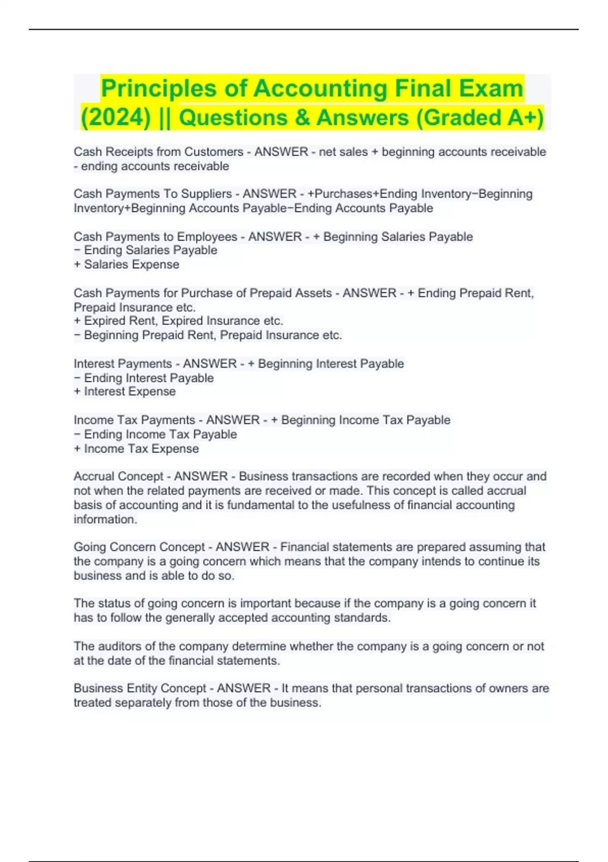 Principles of Accounting Final Exam (2024) || Questions & Answers (Graded A+) Principles of Accounting Final Exam (2024) || Questions & Answers (Graded A+) Cash Receipts from Customers - ANSWER - net sales + beginning accounts receivable - ending accounts receivable Cash Payments To Suppliers - ANSWER - +Purchases+Ending Inventory−Beginning Inventory+Beginning Accounts Payable−Ending Accounts Payable Cash Payments to Employees - ANSWER - + Beginning Salaries Payable − Ending Salaries Payable + Salaries Expense Cash Payments for Purchase of Prepaid Assets - ANSWER - + Ending Prepaid Rent, Prepaid Insurance etc. + Expired Rent, Expired Insurance etc. − Beginning Prepaid Rent, Prepaid Insurance etc. Interest Payments - ANSWER - + Beginning Interest Payable − Ending Interest Payable + Interest Expense Income Tax Payments - ANSWER - + Beginning Income Tax Payable − Ending Income Tax Payable + Income Tax Expense Accrual Concept - ANSWER - Business transactions are recorded when they occur and not when the related payments are received or made. This concept is called accrual basis of accounting and it is fundamental to the usefulness of financial accounting information. Going Concern Concept - ANSWER - Financial statements are prepared assuming that the company is a going concern which means that the company intends to continue its business and is able to do so. The status of going concern is important because if the company is a going concern it has to follow the generally accepted accounting standards. The auditors of the company determine whether the company is a going concern or not at the date of the financial statements. Business Entity Concept - ANSWER - It means that personal transactions of owners are treated separately from those of the business.