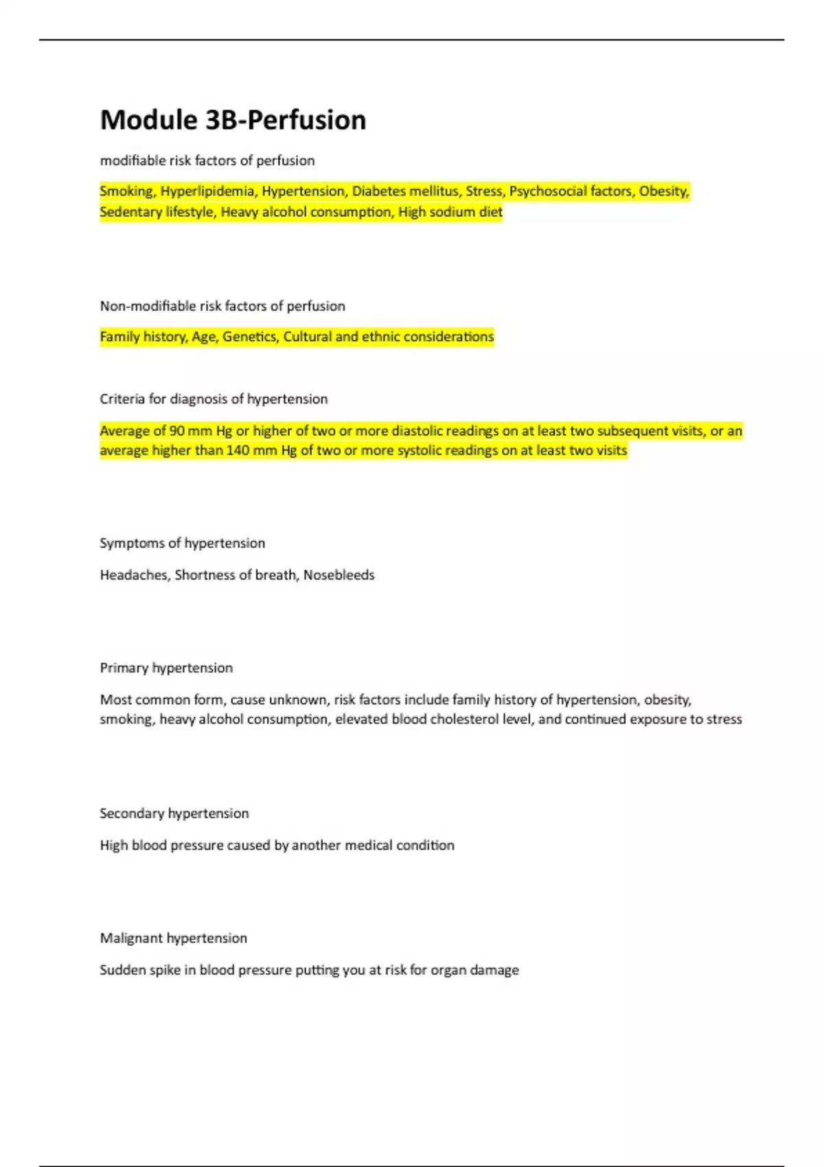 modifiable risk factors of perfusion Smoking, Hyperlipidemia, Hypertension, Diabetes mellitus, Stress, Psychosocial factors, Obesity, Sedentary lifestyle, Heavy alcohol consumption, High sodium diet Non-modifiable risk factors of perfusion Family history, Age, Genetics, Cultural and ethnic considerations Criteria for diagnosis of hypertension Average of 90 mm Hg or higher of two or more diastolic readings on at least two subsequent visits, or an average higher than 140 mm Hg of two or more systolic readings on at least two visits
