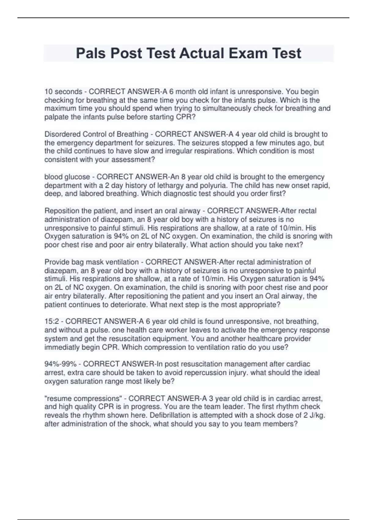 Pals Post Test Actual Exam Test 10 seconds - CORRECT ANSWER-A 6 month old infant is unresponsive. You begin checking for breathing at the same time you check for the infants pulse. Which is the maximum time you should spend when trying to simultaneously check for breathing and palpate the infants pulse before starting CPR? Disordered Control of Breathing - CORRECT ANSWER-A 4 year old child is brought to the emergency department for seizures. The seizures stopped a few minutes ago, but the child continues to have slow and irregular respirations. Which condition is most consistent with your assessment? blood glucose - CORRECT ANSWER-An 8 year old child is brought to the emergency department with a 2 day history of lethargy and polyuria. The child has new onset rapid, deep, and labored breathing. Which diagnostic test should you order first? Reposition the patient, and insert an oral airway - CORRECT ANSWER-After rectal administration of diazepam, an 8 year old boy with a history of seizures is no unresponsive to painful stimuli. His respirations are shallow, at a rate of 10/min. His Oxygen saturation is 94% on 2L of NC oxygen. On examination, the child is snoring with poor chest rise and poor air entry bilaterally. What action should you take next? Provide bag mask ventilation - CORRECT ANSWER-After rectal administration of diazepam, an 8 year old boy with a history of seizures is no unresponsive to painful stimuli. His respirations are shallow, at a rate of 10/min. His Oxygen saturation is 94% on 2L of NC oxygen. On examination, the child is snoring with poor chest rise and poor air entry bilaterally. After repositioning the patient and you insert an Oral airway, the patient continues to deteriorate. What next step is the most appropriate? 15:2 - CORRECT ANSWER-A 6 year old child is found unresponsive, not breathing, and without a pulse. one health care worker leaves to activate the emergency response system and get the resuscitation equipment. You and another healthcare provider immediatly begin CPR. Which compression to ventilation ratio do you use? 94%-99% - CORRECT ANSWER-In post resuscitation management after cardiac arrest, extra care should be taken to avoid repercussion injury. what should the ideal oxygen saturation range most likely be? "resume compressions" - CORRECT ANSWER-A 3 year old child is in cardiac arrest, and high quality CPR is in progress. You are the team leader. The first rhythm check reveals the rhythm shown here. Defibrillation is attempted with a shock dose of 2 J/kg. after administration of the shock, what should you say to you team members? 2-4 J/kg - CORRECT ANSWER-A 4 year old child in cardiac arrest is brought to the emergency department by ambulance. High quality CPR is being performed. The cardiac monitor displays the rhythm strip shown here. The estimated weight of the child is 20 kg. What dose range should you use for the initial defibrillation? 40 Joules - CORRECT ANSWER-A 4 year old child in cardiac arrest is brought to the emergency department by ambulance. High quality CPR is being performed. The cardiac monitor displays the rhythm strip shown here. The estimated weight of the child is 20 kg. As the team leader, how many joules do you tell your team member to use to perform initial Defib? Allowing complete chest wall recoil after each compression - CORRECT ANSWER-You are the team leader during a pediatric resuscita