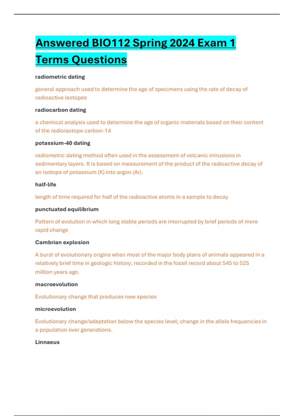 Answered BIO112 Spring 2024 Exam 1 Terms Questions