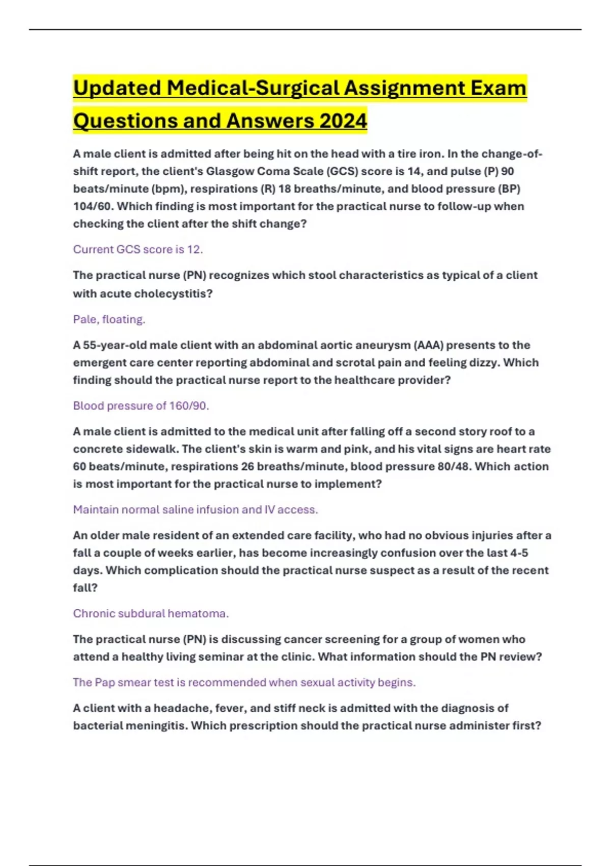 Updated Medical-Surgical Assignment Exam Questions and Answers 2024