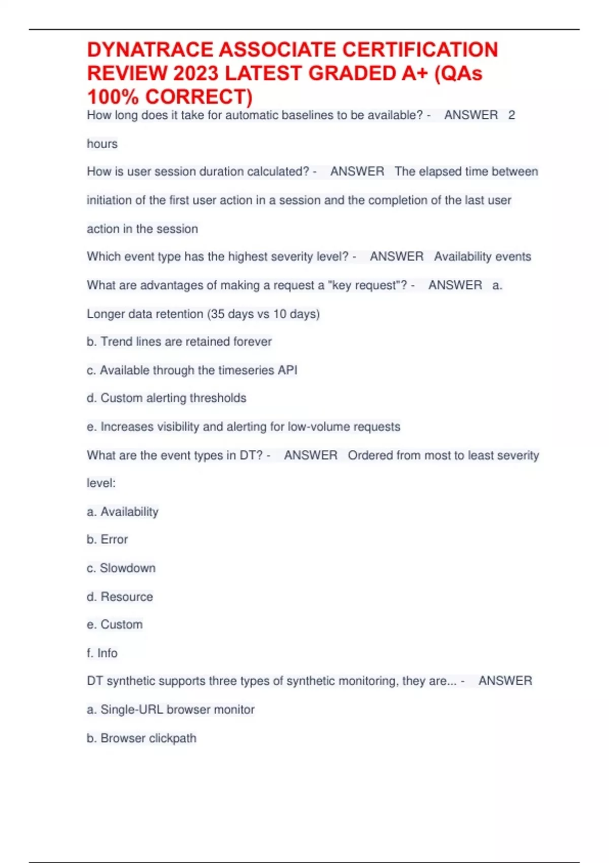 DYNATRACE ASSOCIATE CERTIFICATION REVIEW 2023 LATEST GRADED A+ (QAs 100% CORRECT)