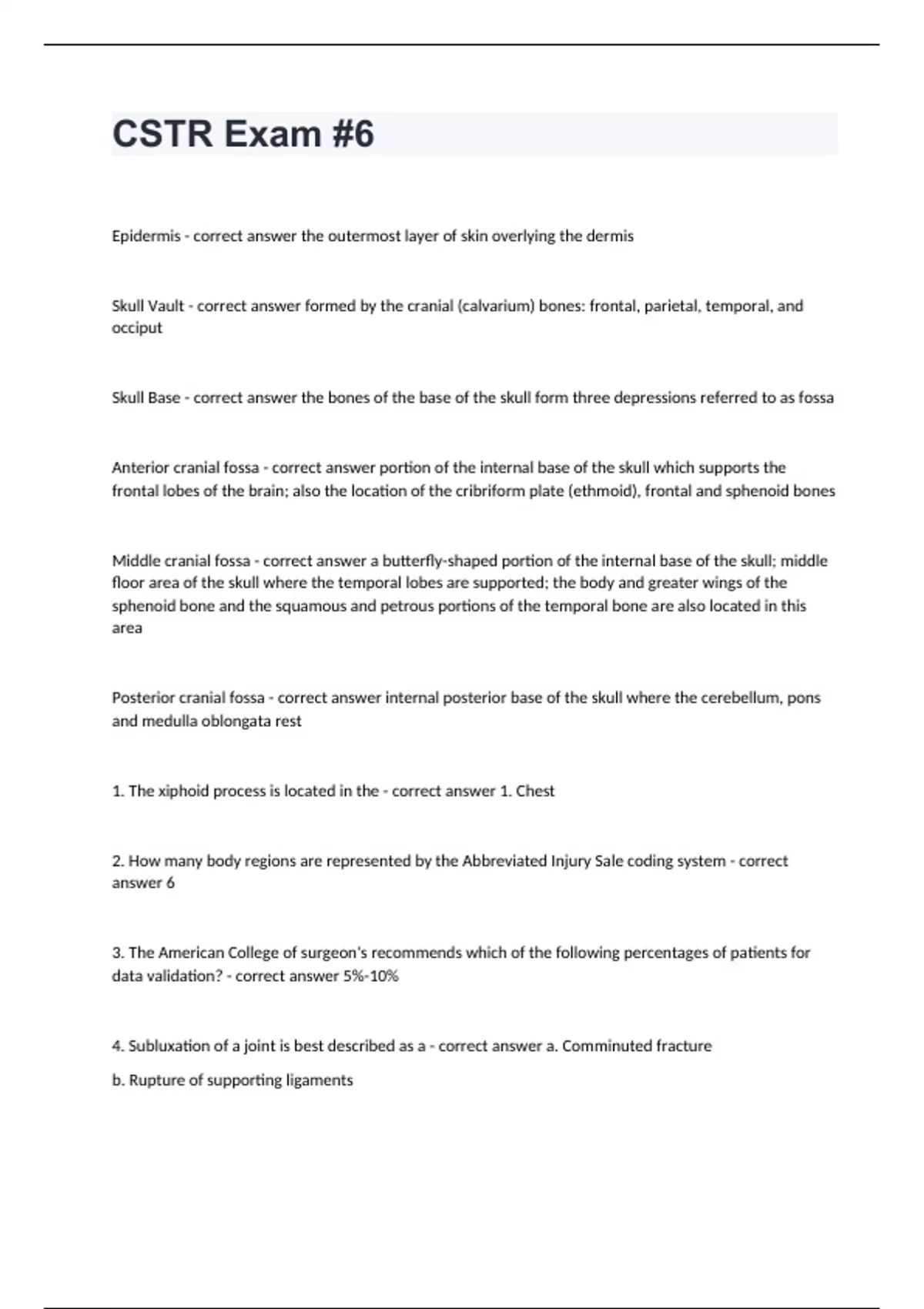 CSTR Exam #6Epidermis - correct answer the outermost layer of skin overlying the dermis Skull Vault - correct answer formed by the cranial (calvarium) bones: frontal, parietal, temporal, and occiput Skull Base - correct answer the bones of the base of the skull form three depressions referred to as fossa Anterior cranial fossa - correct answer portion of the internal base of the skull which supports the frontal lobes of the brain; also the location of the cribriform plate (ethmoid), frontal and sphenoid bones Middle cranial fossa - correct answer a butterfly-shaped portion of the internal base of the skull; middle floor area of the skull where the temporal lobes are supported; the body and greater wings of the sphenoid bone and the squamous and petrous portions of the temporal bone are also located in this area Posterior cranial fossa - correct answer internal posterior base of the skull where the cerebellum, pons and medulla oblongata rest 1. The xiphoid process is located in the - correct answer 1. Chest 2. How many body regions are represented by the Abbreviated Injury Sale coding system - correct answer 6 3. The American College of surgeon's recommends which of the following percentages of patients for data validation? - correct answer 5%-10%