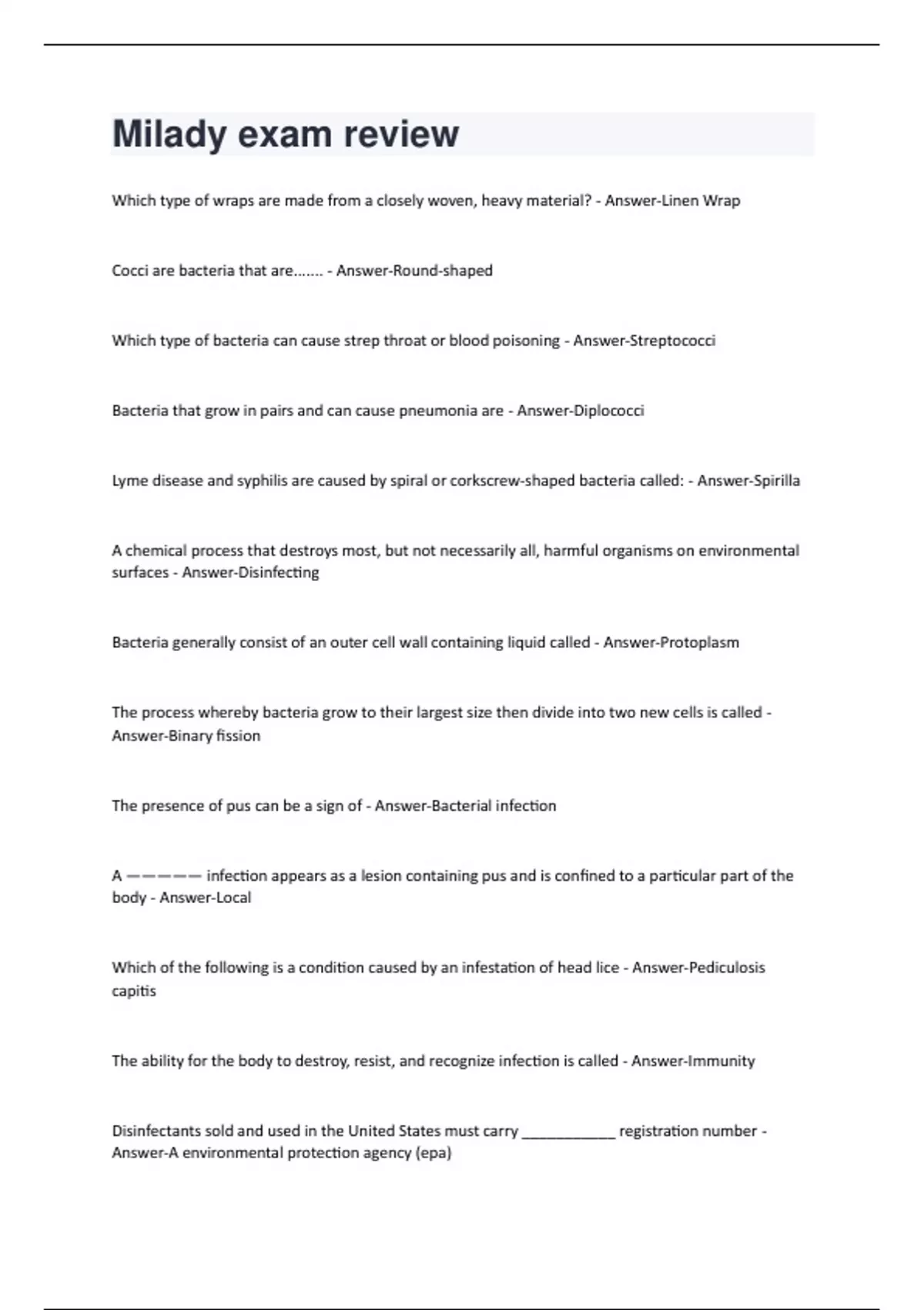 Which type of wraps are made from a closely woven, heavy material? - Answer-Linen Wrap Cocci are bacteria that are....... - Answer-Round-shaped Which type of bacteria can cause strep throat or blood poisoning - Answer-Streptococci Bacteria that grow in pairs and can cause pneumonia are - Answer-Diplococci Lyme disease and syphilis are caused by spiral or corkscrew-shaped bacteria called: - Answer-Spirilla A chemical process that destroys most, but not necessarily all, harmful organisms on environmental surfaces - Answer-Disinfecting Bacteria generally consist of an outer cell wall containing liquid called - Answer-Protoplasm The process whereby bacteria grow to their largest size then divide into two new cells is called - Answer-Binary fission The presence of pus can be a sign of - Answer-Bacterial infection A ————— infection appears as a lesion containing pus and is confined to a particular part of the body - Answer-Local Which of the following is a condition caused by an infestation of head lice - Answer-Pediculosis capitis The ability for the body to destroy, resist, and recognize infection is called - Answer-Immunity Disinfectants sold and used in the United States must carry ___________ registration number - Answer-A environmental protection agency (epa)Which agency publishes the guidelines known as standard precautions - Answer-CDC In 2012, osha agreed to comply with globally harmonized system of classification and labeling of chemicals system, which requires the use of standard format called ___________________ to replace the MSDS - Answer-Safety data sheet A type of disinfectant with a very high PH that can damage the skin or eyes is called - AnswerPhenolic disinfectants When washing your hands, after you Have used warm water applied soap and then rubbed your hands together until a lather forms, used a disinfected nail brush to brush your nails horizontally back and forth under the free edges and then up and down along the nail fold, this process takes about.... - Answer-60 seconds Antiseptics are intended for - Answer-Reducing microbes on the skin