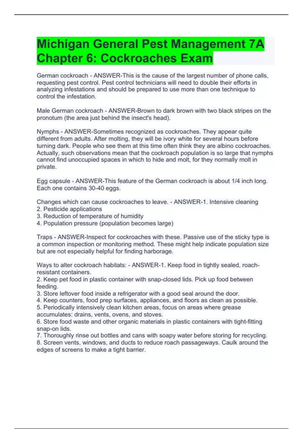 Michigan General Pest Management 7A Chapter 6: Cockroaches Exam