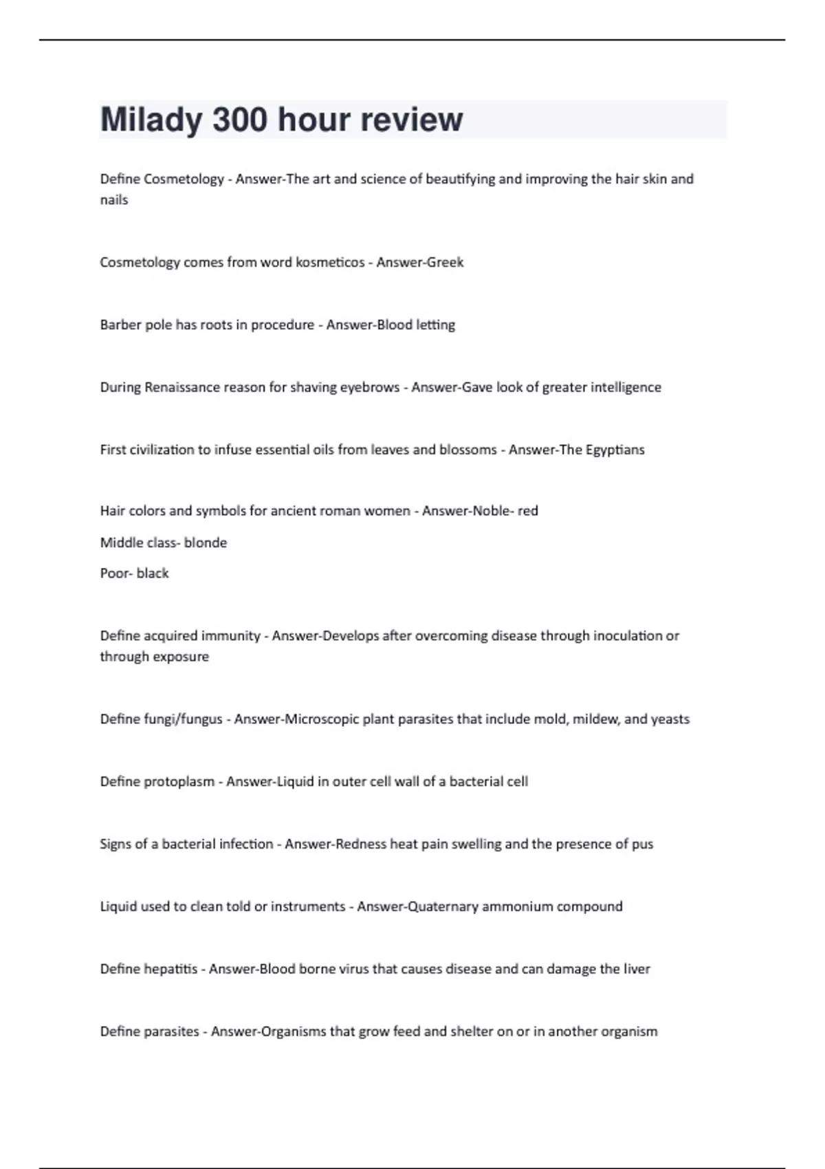 Define Cosmetology - Answer-The art and science of beautifying and improving the hair skin and nails Cosmetology comes from word kosmeticos - Answer-Greek Barber pole has roots in procedure - Answer-Blood letting During Renaissance reason for shaving eyebrows - Answer-Gave look of greater intelligence First civilization to infuse essential oils from leaves and blossoms - Answer-The Egyptians Hair colors and symbols for ancient roman women - Answer-Noble- red Middle class- blonde Poor- black Define acquired immunity - Answer-Develops after overcoming disease through inoculation or through exposure Define fungi/fungus - Answer-Microscopic plant parasites that include mold, mildew, and yeasts Define protoplasm - Answer-Liquid in outer cell wall of a bacterial cell Signs of a bacterial infection - Answer-Redness heat pain swelling and the presence of pus Liquid used to clean told or instruments - Answer-Quaternary ammonium compound Define hepatitis - Answer-Blood borne virus that causes disease and can damage the liver Define parasites - Answer-Organisms that grow feed and shelter on or in another organismHow long should hand washing take - Answer-20 seconds Define efficacy - Answer-Ability to produce an effecf If item can not be sanitized it must be - Answer-Discarded Define wave - Answer-Curved lines repeating in opposite directions Define silhoutte - Answer-Part of overall design that a client will respond to first Styling options for round face shape - Answer-Height or volume on top with closeness or no volume on sides Define space - Answer-Area surrounding the form or the area the hairstyle occupies How to create a bold dramatic accent in the hair - Answer-A single line of color or a series of repeated lines of color Define proportion - Answer-The comparative relationship of one thing to another The characteristics of hair type - Answer-Wave patterns and hair texture Define profile - Answer-Outline of the face head or figure seen in a side view When to use a curved part - Answer-A receding hairline or high forehead Define distillation - Answer-Heat water to vapor, the condense vapor to collect as liquid Define scalp astringent lotion - Answer-Removes oil accumulation used before styling Define Malassezia - Answer-Fungus that promotes the growth of dandruffFirst manipulation during a shampoo - Answer-Start at the hairline in back and forth motions Define hydrophilic and lipophyllic - Answer-Water attracting head, oil attracting tail Type of brushes with bristles that have tiny overlapping layers or scales - Answer-Natural bristles Define primary surfactant - Answer-Base detergent, second ingredient most shampoos have in common Define filtration - Answer-Pass through a porous substance such as filter paper or charcoal removes clay sand etc When to use clarifying shampoo - Answer-When buildup is evident, after swimming, prior to all chemical services Define texturizing - Answer-Process of removing excess bulk without shortening the length How to find the parietal ridge - Answer-Found by placing comb flat on side of head, where head starts to curve away from comb Name for cut when hair is cut at 180 degrees - Answer-Long layered haircut Type of shear that increases blending - Answer-Texturizing shears Type of line that blends long layers into short and creates movement - Answer-Diagonal Define sections - Answer-Uniform working areas