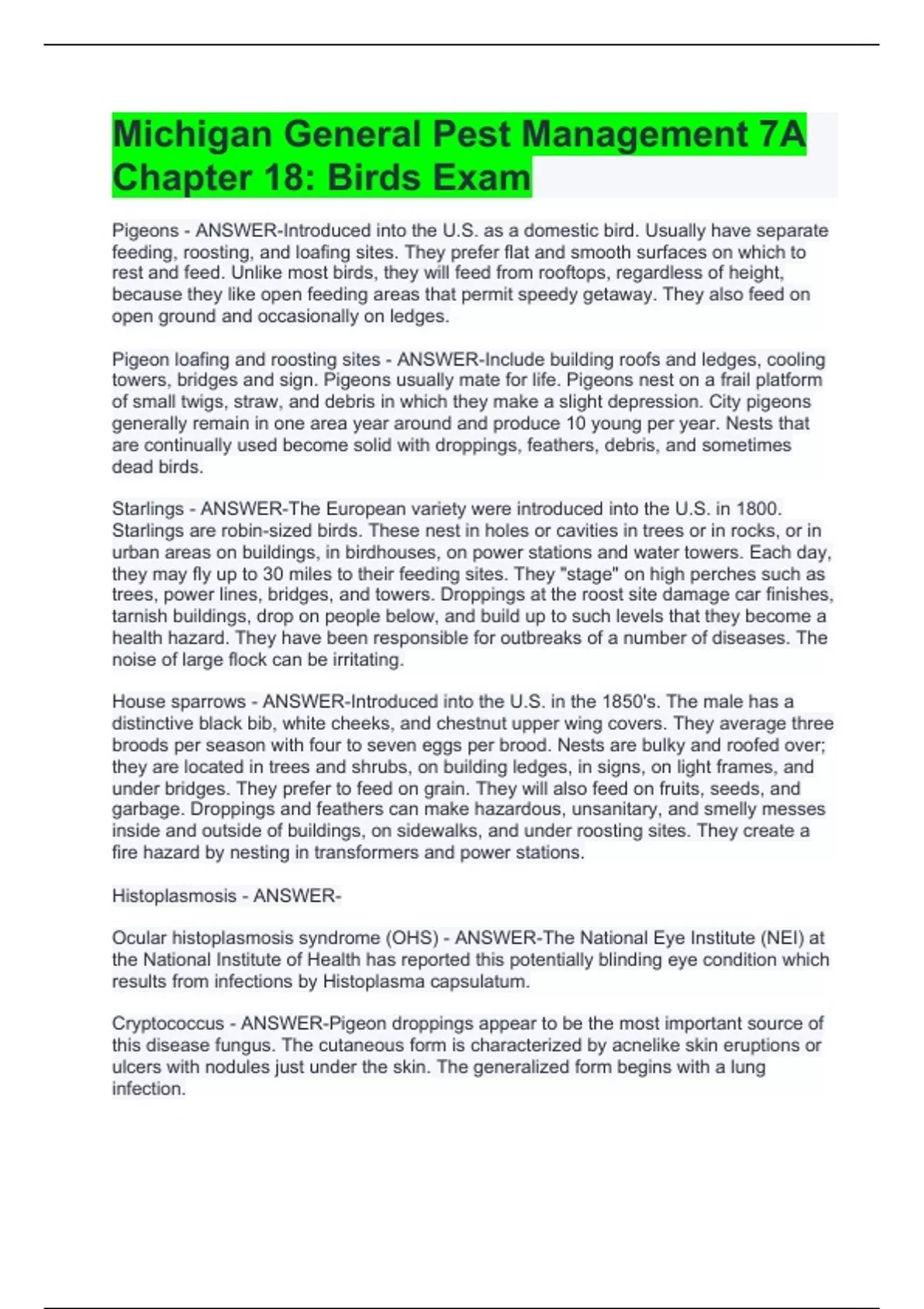 Michigan General Pest Management 7A Chapter 18: Birds Exam