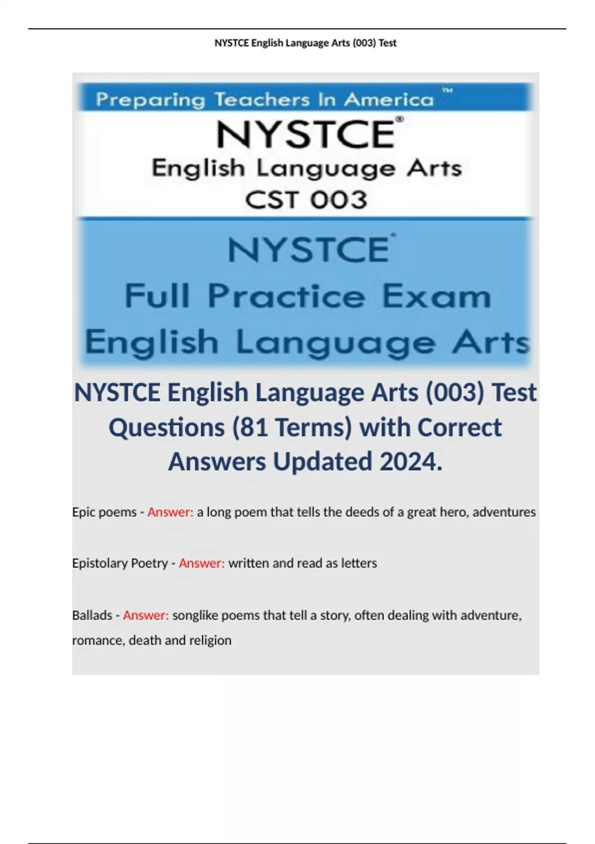 NYSTCE English Language Arts (003) Test Questions (81 Terms) with Correct Answers Updated 2024.