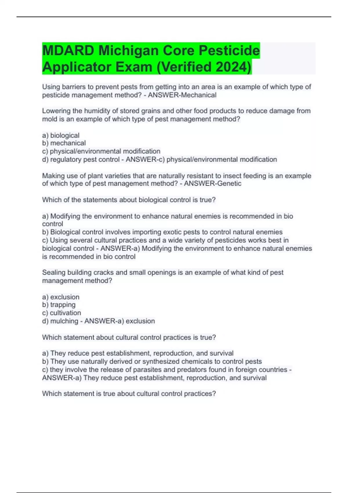 MDARD Michigan Core Pesticide Applicator Exam (Verified 2024)