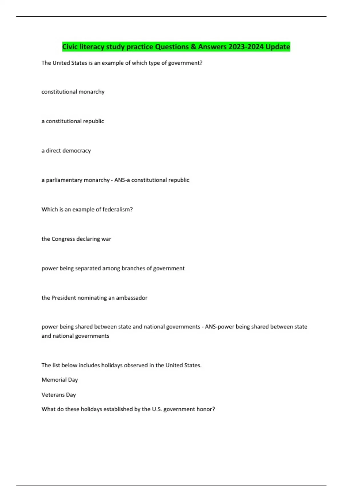 Civic literacy study practice Questions & Answers Update The United States is an example of which type of government? constitutional monarchy a constitutional republic a direct democracy a parliamentary monarchy - ANS-a constitutional republic Which is an example of federalism? the Congress declaring war power being separated among branches of government the President nominating an ambassador power being shared between state and national governments - ANS-power being shared between state and national governments The list below includes holidays observed in the United States. Memorial Day Veterans Day What do these holidays established by the U.S. government honor? CONTINUES...