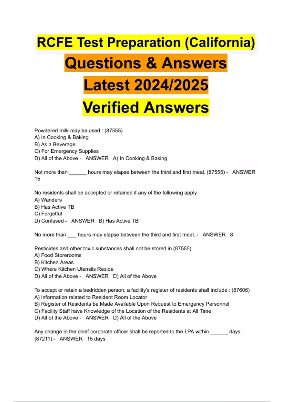 RCFE Test Preparation (California) Questions & Answers Latest 2024/2025 Verified Answers