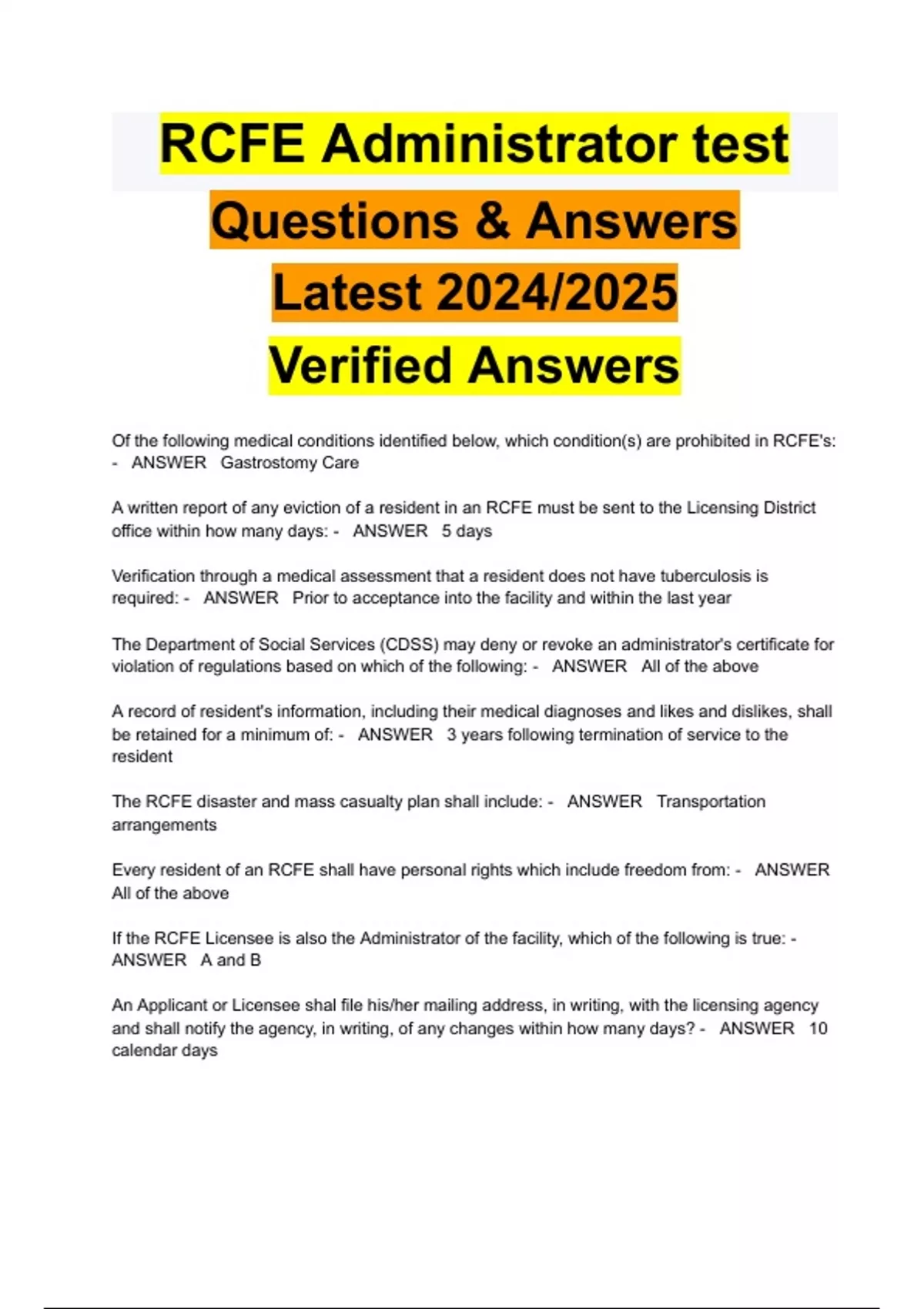 RCFE Administrator test Questions & Answers Latest 2024/2025 Verified Answers
