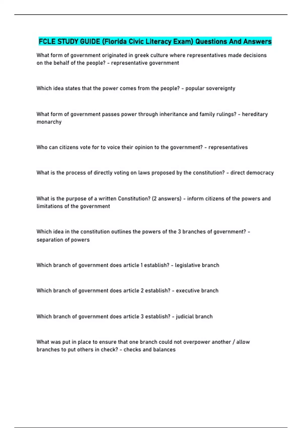 FCLE STUDY GUIDE (Florida Civic Literacy Exam) Questions And Answers