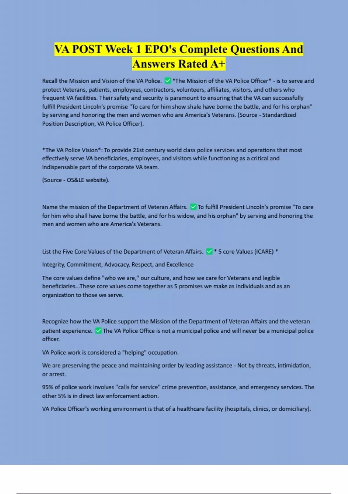 VA POST Week 1 EPO's Complete Questions And Answers Rated A+