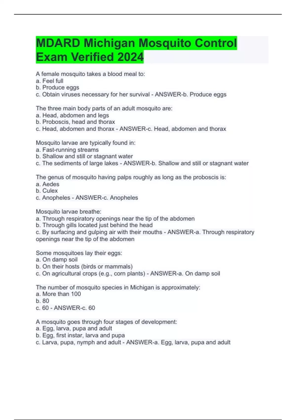 MDARD Michigan Mosquito Control Exam Verified 2024