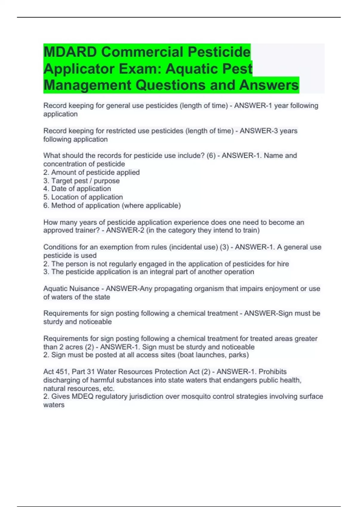 MDARD Commercial Pesticide Applicator Exam: Aquatic Pest Management Questions and Answers