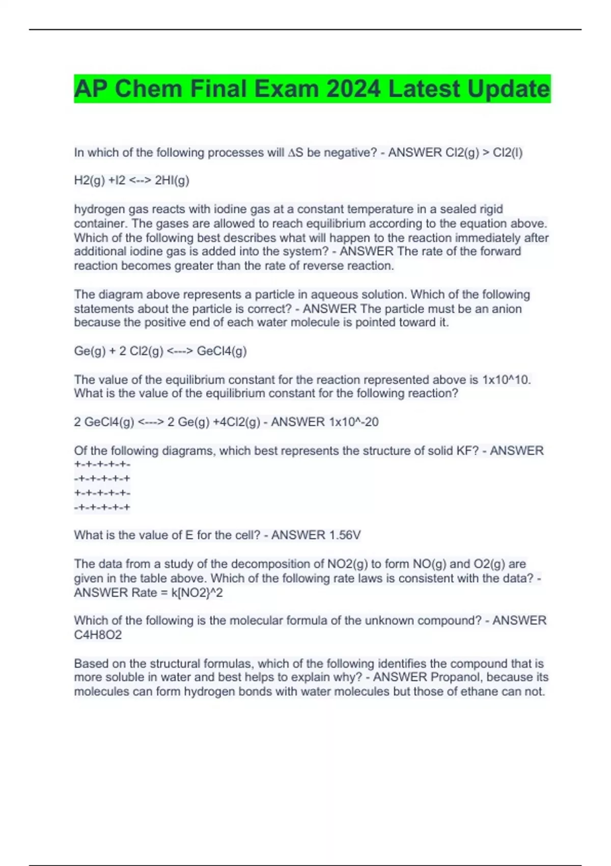 In which of the following processes will ∆S be negative? - ANSWER Cl2(g) > Cl2(l) H2(g) +I2 <--> 2HI(g) hydrogen gas reacts with iodine gas at a constant temperature in a sealed rigid container. The gases are allowed to reach equilibrium according to the equation above. Which of the following best describes what will happen to the reaction immediately after additional iodine gas is added into the system? - ANSWER The rate of the forward reaction becomes greater than the rate of reverse reaction. The diagram above represents a particle in aqueous solution. Which of the following statements about the particle is correct? - ANSWER The particle must be an anion because the positive end of each water molecule is pointed toward it. Ge(g) + 2 Cl2(g) <---> GeCl4(g) The value of the equilibrium constant for the reaction represented above is 1x10^10. What is the value of the equilibrium constant for the following reaction? 2 GeCl4(g) <---> 2 Ge(g) +4Cl2(g) - ANSWER 1x10^-20 Of the following diagrams, which best represents the