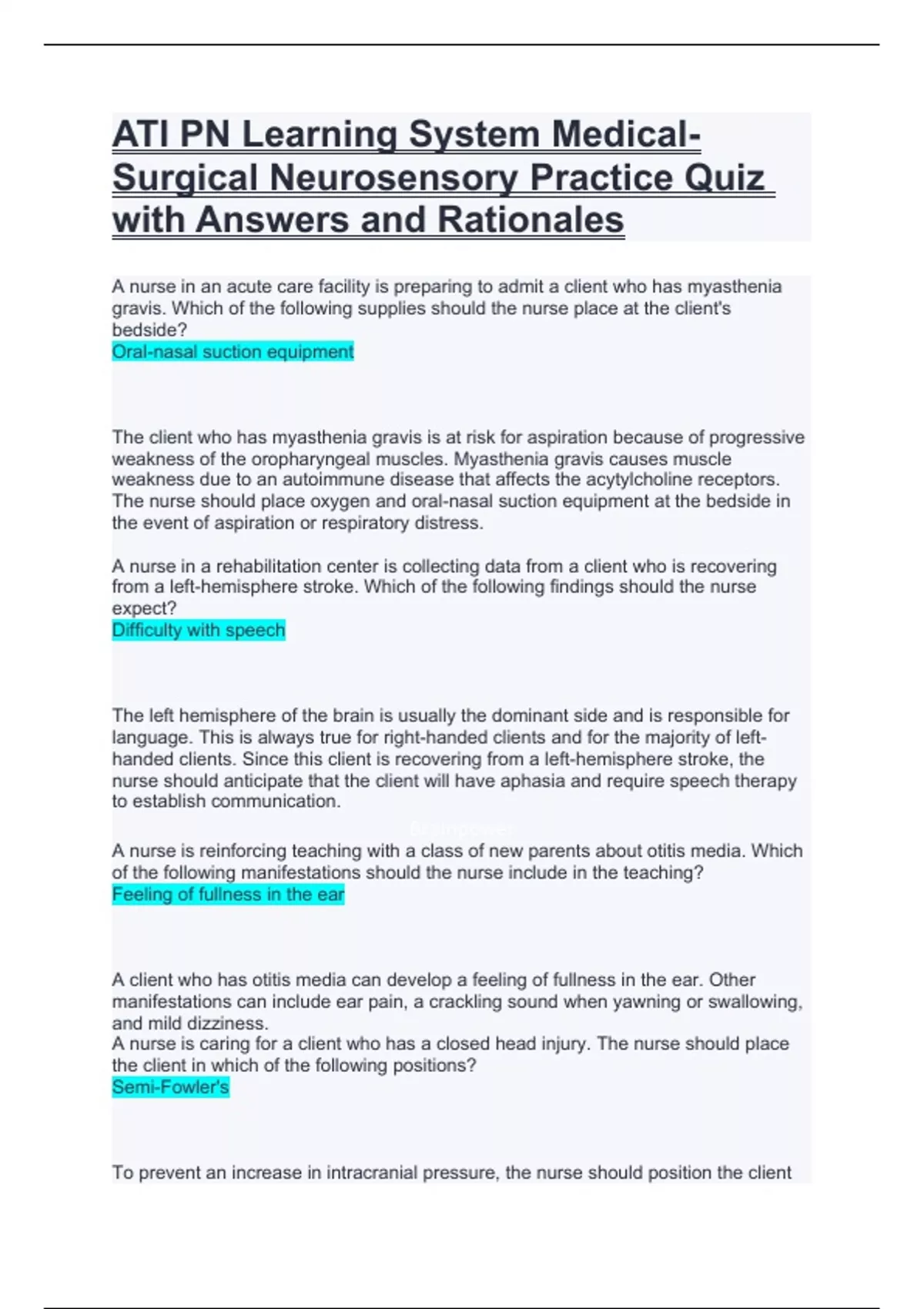 ATI PN Learning System Medical-Surgical Neurosensory Practice Quiz with Answers and Rationales