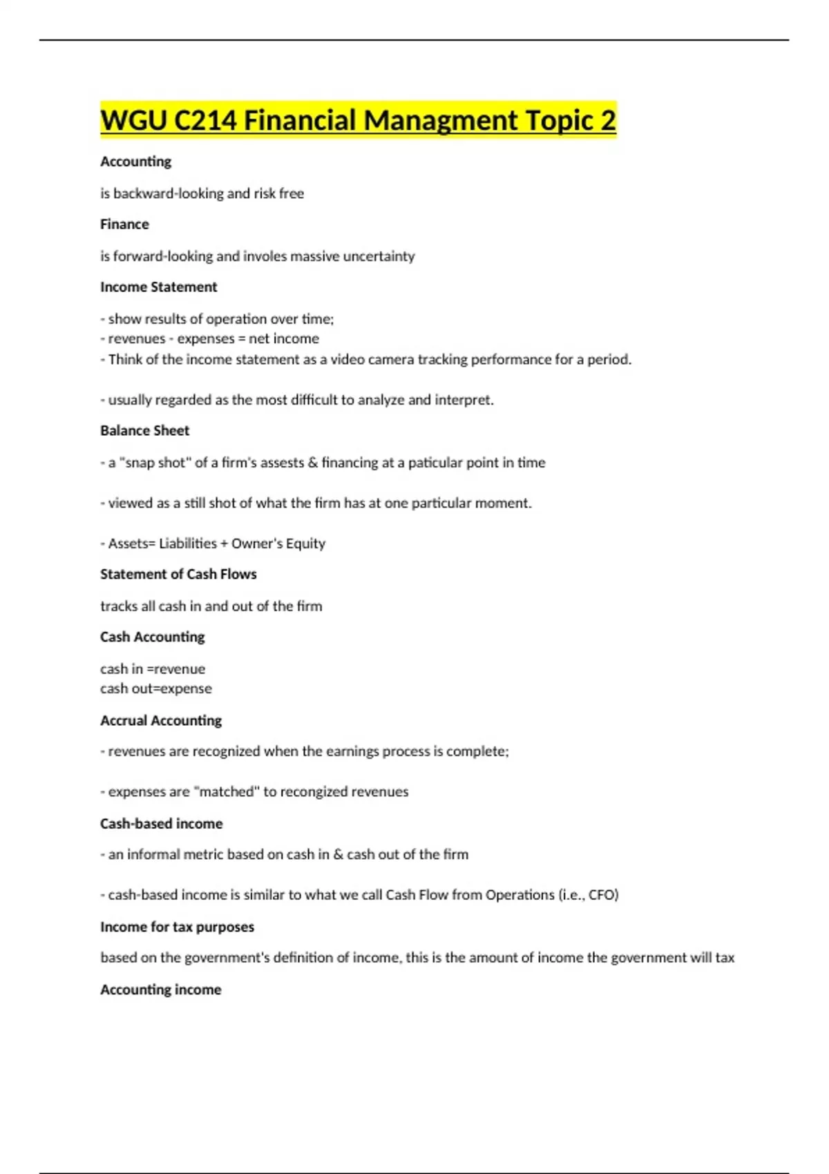 WGU C214 Financial Managment Topic 2 Accounting is backward-looking and risk free Finance is forward-looking and involes massive uncertainty Income Statement - show results of operation over time; - revenues - expenses = net income - Think of the income statement as a video camera tracking performance for a period. - usually regarded as the most difficult to analyze and interpret. Balance Sheet - a "snap shot" of a firm's assests & financing at a paticular point in time - viewed as a still shot of what the firm has at one particular moment. - Assets= Liabilities + Owner's Equity Statement of Cash Flows tracks all cash in and out of the firm Cash Accounting cash in =revenue cash out=expense Accrual Accounting - revenues are recognized when the earnings process is complete; - expenses are "matched" to recongized revenues Cash-based income - an informal metric based on cash in & cash out of the firm - cash-based income is similar to what we call Cash Flow from Operations (i.e., CFO) Income for tax purposes based on the government's definition of income, this is the amount of income the government will tax Accounting income