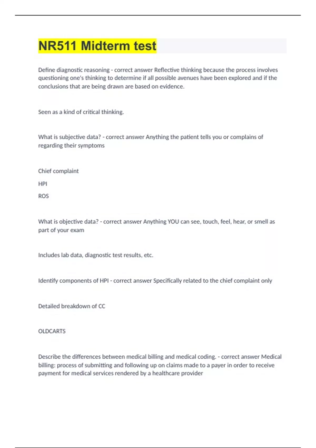 NR511 Midterm test Define diagnostic reasoning - correct answer Reflective thinking because the process involves questioning one's thinking to determine if all possible avenues have been explored and if the conclusions that are being drawn are based on evidence. Seen as a kind of critical thinking. What is subjective data? - correct answer Anything the patient tells you or complains of regarding their symptoms Chief complaint HPI ROS What is objective data? - correct answer Anything YOU can see, touch, feel, hear, or smell as part of your exam Includes lab data, diagnostic test results, etc. Identify components of HPI - correct answer Specifically related to the chief complaint only Detailed breakdown of CC