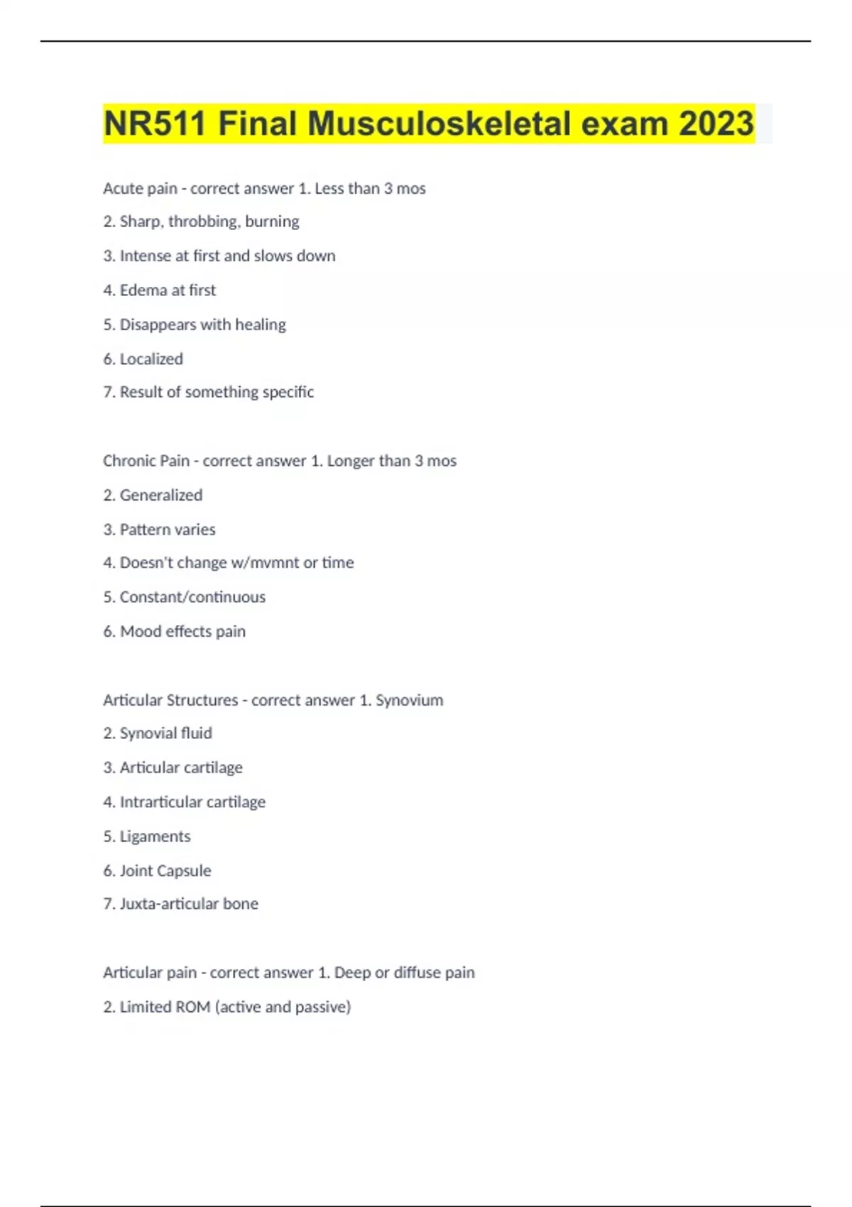 NR511 Final Musculoskeletal exam 2023 Acute pain - correct answer 1. Less than 3 mos 2. Sharp, throbbing, burning 3. Intense at first and slows down 4. Edema at first 5. Disappears with healing 6. Localized 7. Result of something specific Chronic Pain - correct answer 1. Longer than 3 mos 2. Generalized 3. Pattern varies 4. Doesn't change w/mvmnt or time 5. Constant/continuous 6. Mood effects pain Articular Structures - correct answer 1. Synovium