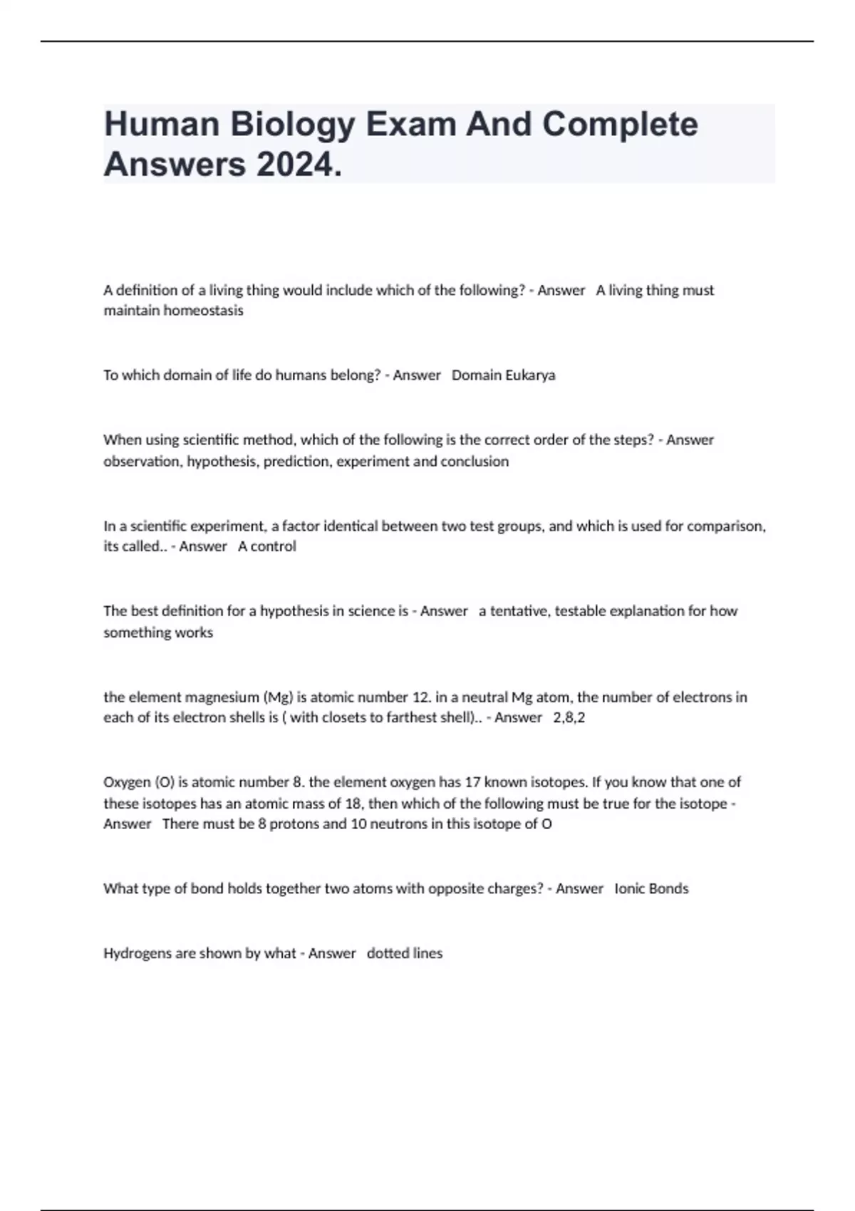 A definition of a living thing would include which of the following? - Answer A living thing must maintain homeostasis To which domain of life do humans belong? - Answer Domain Eukarya When using scientific method, which of the following is the correct order of the steps? - Answer observation, hypothesis, prediction, experiment and conclusion In a scientific experiment, a factor identical between two test groups, and which is used for comparison, its called.. - Answer A control The best definition for a hypothesis in science is - Answer a tentative, testable explanation for how something works the element magnesium (Mg) is atomic number 12. in a neutral Mg atom, the number of electrons in each of its electron shells is ( with closets to farthest shell).. - Answer 2,8,2 Oxygen (O) is atomic number 8. the element oxygen has 17 known isotopes. If you know that one of these isotopes has an atomic mass of 18, then which of the following must be true for the isotope - Answer There must be 8 protons and 10 neutrons in this isotope of O What type of bond holds together two atoms with opposite charges? - Answer Ionic Bonds Hydrogens are shown by what - Answer dotted lines