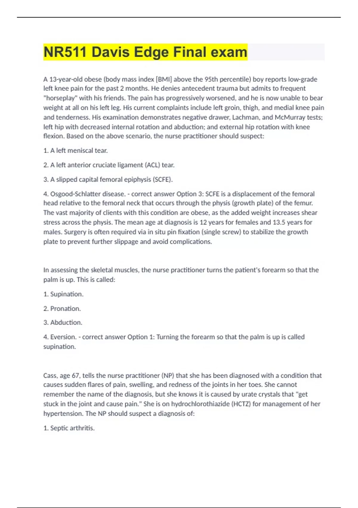NR511 Davis Edge Final exam A 13-year-old obese (body mass index [BMI] above the 95th percentile) boy reports low-grade left knee pain for the past 2 months. He denies antecedent trauma but admits to frequent "horseplay" with his friends. The pain has progressively worsened, and he is now unable to bear weight at all on his left leg. His current complaints include left groin, thigh, and medial knee pain and tenderness. His examination demonstrates negative drawer, Lachman, and McMurray tests; left hip with decreased internal rotation and abduction; and external hip rotation with knee flexion. Based on the above scenario, the nurse practitioner should suspect: 1. A left meniscal tear. 2. A left anterior cruciate ligament (ACL) tear. 3. A slipped capital femoral epiphysis (SCFE). 4. Osgood-Schlatter disease. - correct answer Option 3: SCFE is a displacement of the femoral head relative to the femoral neck that occurs through the physis (growth plate) of the femur. The vast majority of clients with this condition are obese, as the added weight increases shear stress across the physis. The mean age at diagnosis is 12 years for females and 13.5 years for males. Surgery is often required via in situ pin fixation (single screw) to stabilize the growth plate to prevent further slippage and avoid complications.